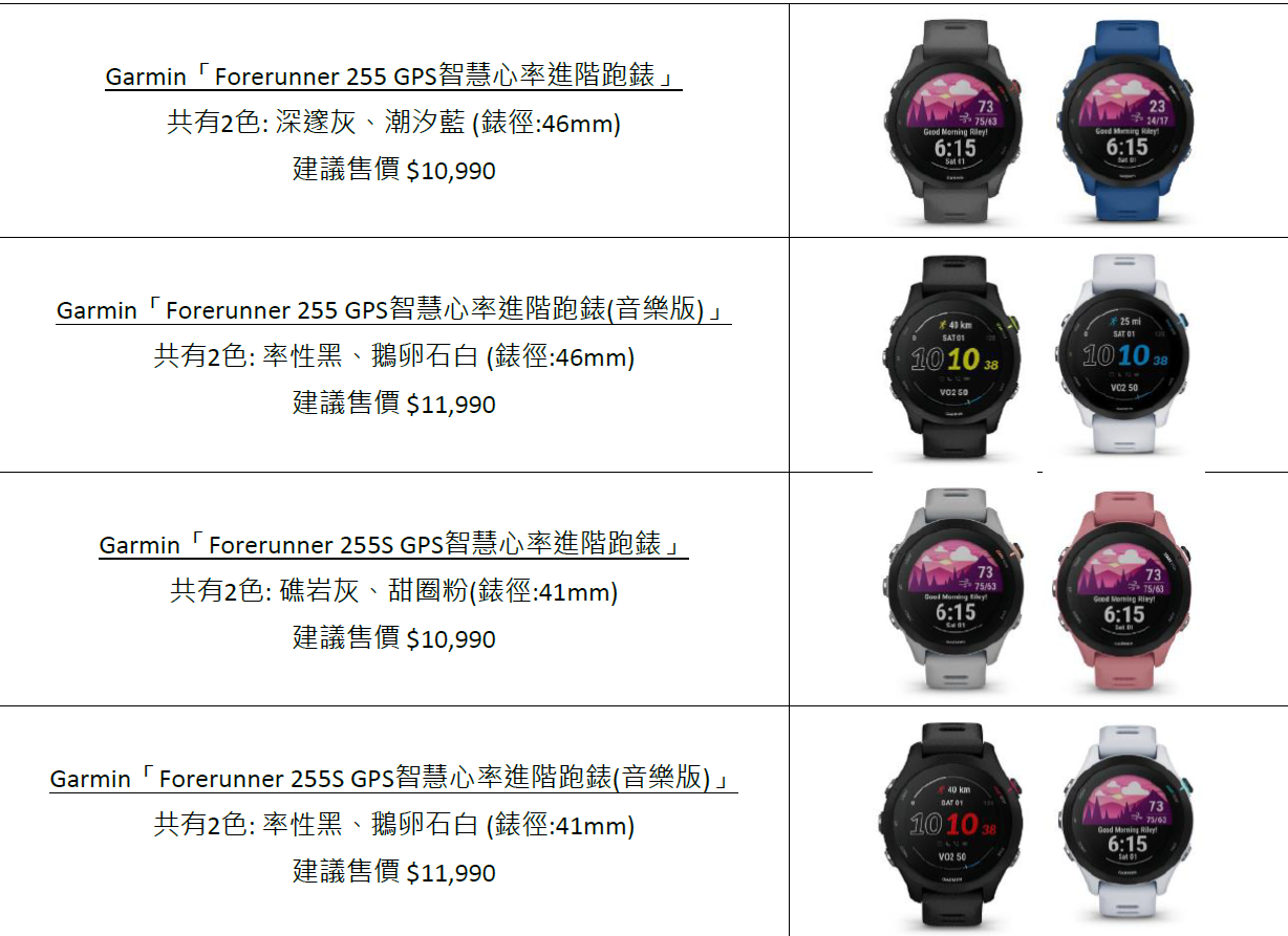 Forerunner 955 、 Forerunner 255 全系列智慧跑錶將於 7 月 29 日上午 11 點全台正式開賣,Forerunner 955 系列推出一般版及太陽能版共 4 款 2 色,建議售價 NT$16,990 元起;Forerunner 255 系列推出雙錶徑的一般版及音樂版共 8 款 6 色,建議售價 NT$10,990 元起。