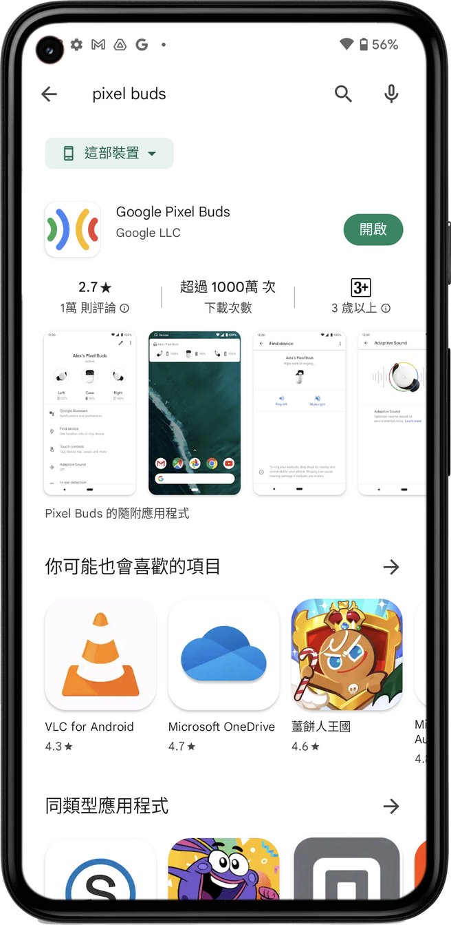 需要搭配使用的 APP 名稱是 Google Pixel Buds,和耳機同名稱,在 Google play 商店搜尋可以找到。