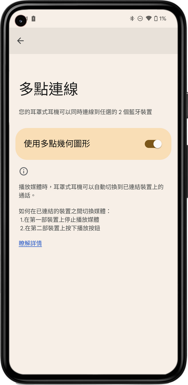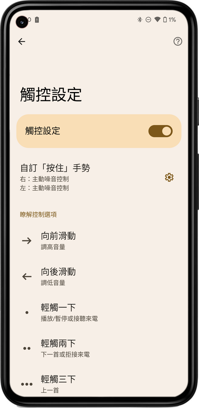 配對手機使用時,按下耳機背面的配對鈕直指示燈變成白色閃爍狀態就可以開始和手機做配對,配對完後就可以在 APP 中看到兩隻耳機還有充電盒的電量狀態,可以參考 APP 提供的教學課程介紹的相關功能外,也可以開始進一步從 APP 中做各種的細節設定,直接動手玩玩看就是最快認識新玩具的最佳方式啦。