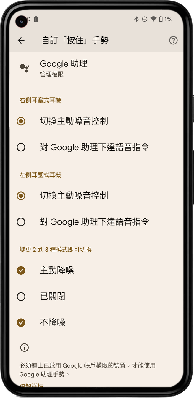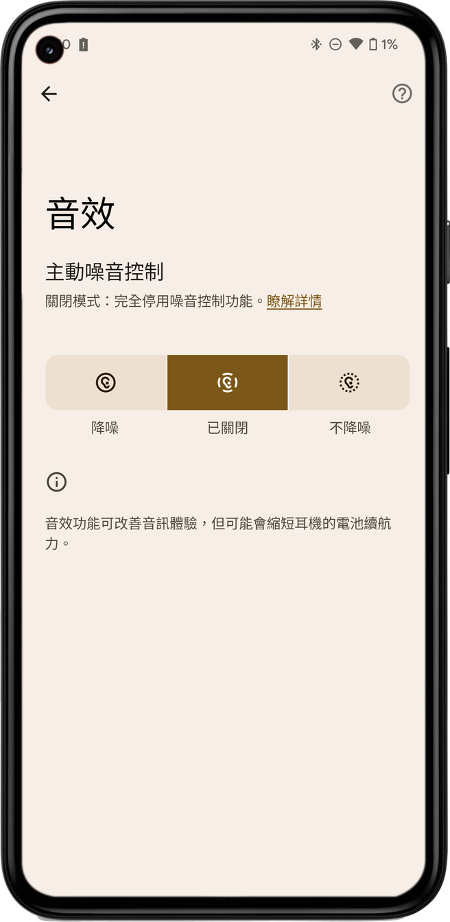 Pixel Buds Pro 提供有主動降噪的功能,透過 APP 的音效選單裡,也可以選擇完全關閉降噪功能來延長電池的使用續航力,對於音質要求比較高的人則是建議把主動降噪功能打開,會讓聆聽音樂的沉浸感受大有提昇。