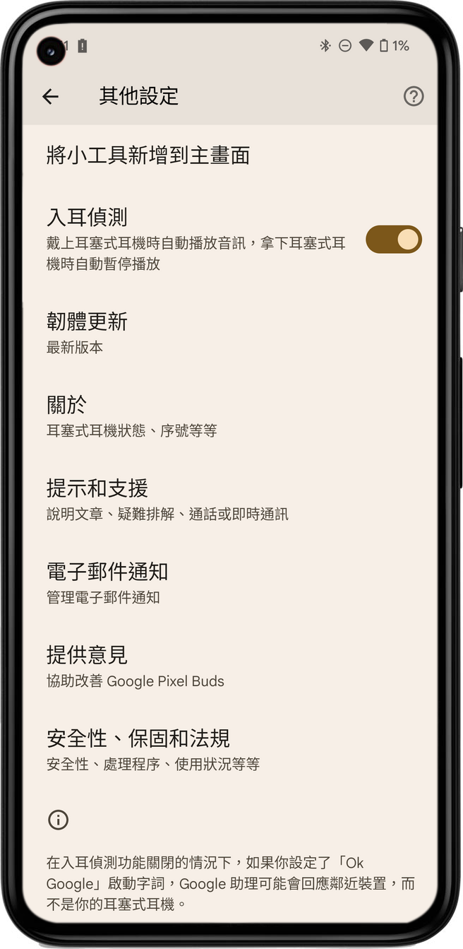Pixel Buds Pro 除了有適用於控制音樂、通話還有 Google 助理的電容式觸控感應器以外,也搭載紅外線鄰近感測器,透過入耳偵測的功能可以自動播放或暫停正在播放的內容