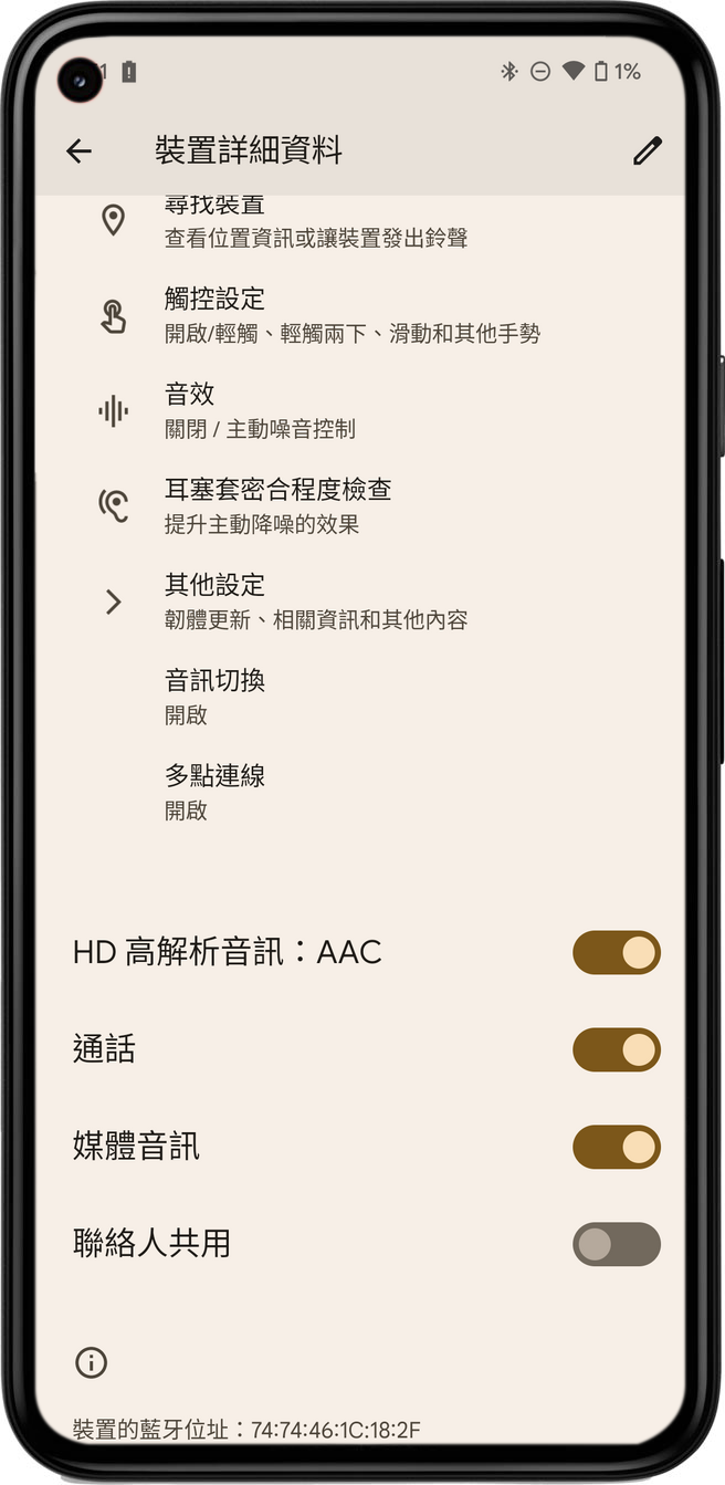 透過裝置詳細資料的選單中,我們也可以與 APP 搭配使用來檢查耳塞套的密合度來提升耳機與你人機一體的密合感,除了可以讓降噪功能有更完美的發揮以外,也能開啟 HD 高解析音訊的相關設定來幫助提升通話品質;