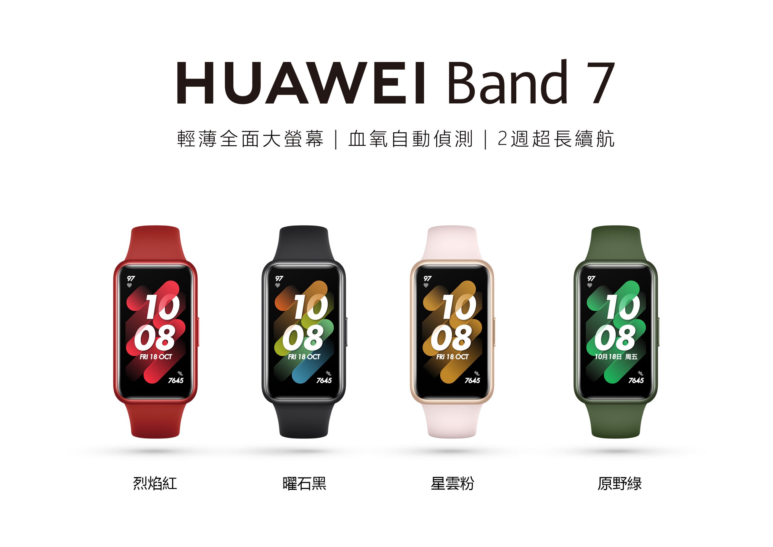 Band 7 豐富的顏色包含曜石黑、原野綠、星雲粉和烈焰紅,你可以自由選擇所愛並完美融合你的日常風格;同時提供 4000+精緻錶盤*可供使用,新增常亮錶盤,在螢幕關閉時也可以顯示關鍵資訊,每一次的亮屏,都讓你眼睛一亮!