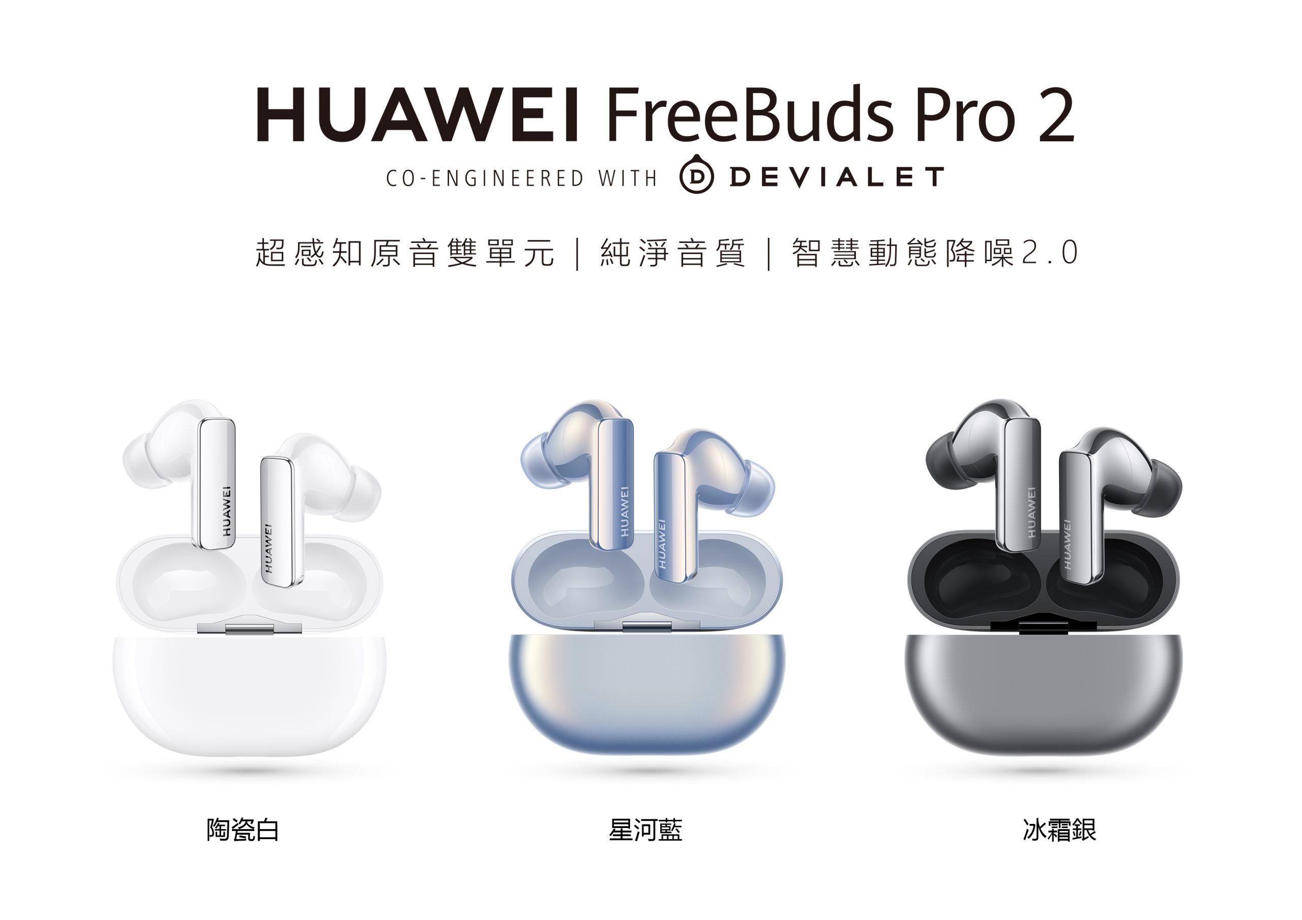 HUAWEI FreeBuds Pro 2 系列共推出三種顏色:星河藍、陶瓷白、冰霜銀,售價 NTD $5,990,8/1 起於各通路開賣。