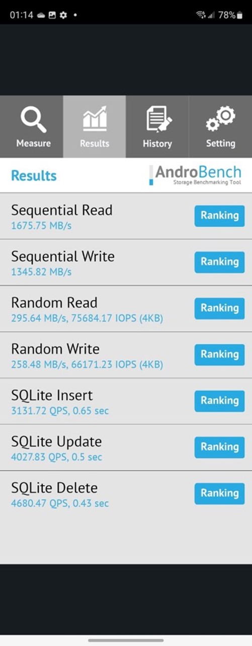 其實除了 CPU 處理器與記憶體,內建儲存空間的讀取/寫入速度也非常影響到日常使用的順暢度,這裡使用 AndroBench 實測讀寫速度,Samsung Galaxy Z Fold4 測得的結果為讀取 1675 MB/sec MB,寫入為 1345 MB/sec