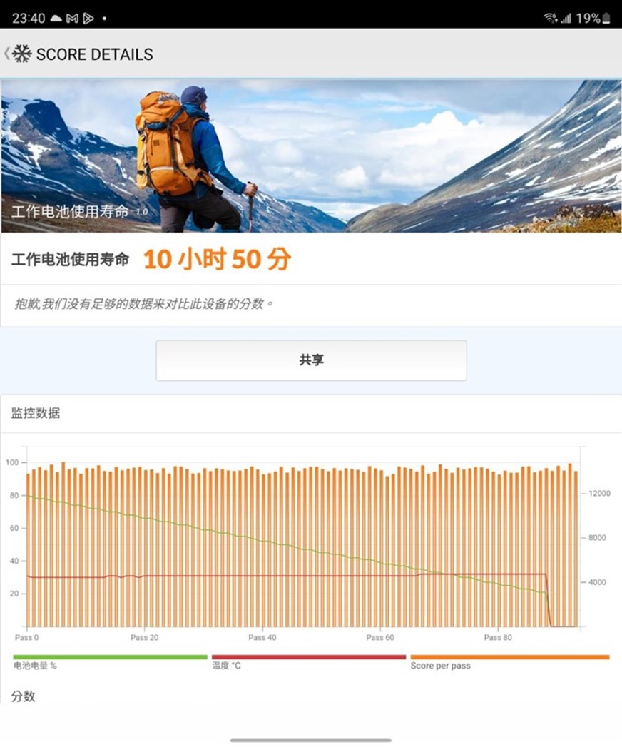 Z Fold4 機器內建電池容量為 4400 mAh,容量部分與 Z Fold3 維持相同大小,不過由於採用更好的 S8+ Gen 1 處理器,電力表現可以說進步十分明顯,這裡實測電力部分以 PCMARK 做標準測試,以量測儀器固定統一亮度為 200nits,測試 80% ~ 20% 間的電力運行,模擬上網、工作、遊戲的混合應用,測試方式與標準可以參考這篇說明。