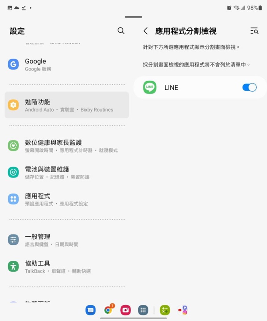 過去需要安裝官方 Good Lock 才有的許多摺疊機進階功能現在也扶正直接加入了系統內建功能,像是可以指定程式運行在特定比例