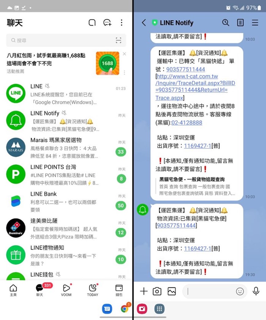 特殊程式例如 Line 還可以活用摺疊機實現多視窗功能