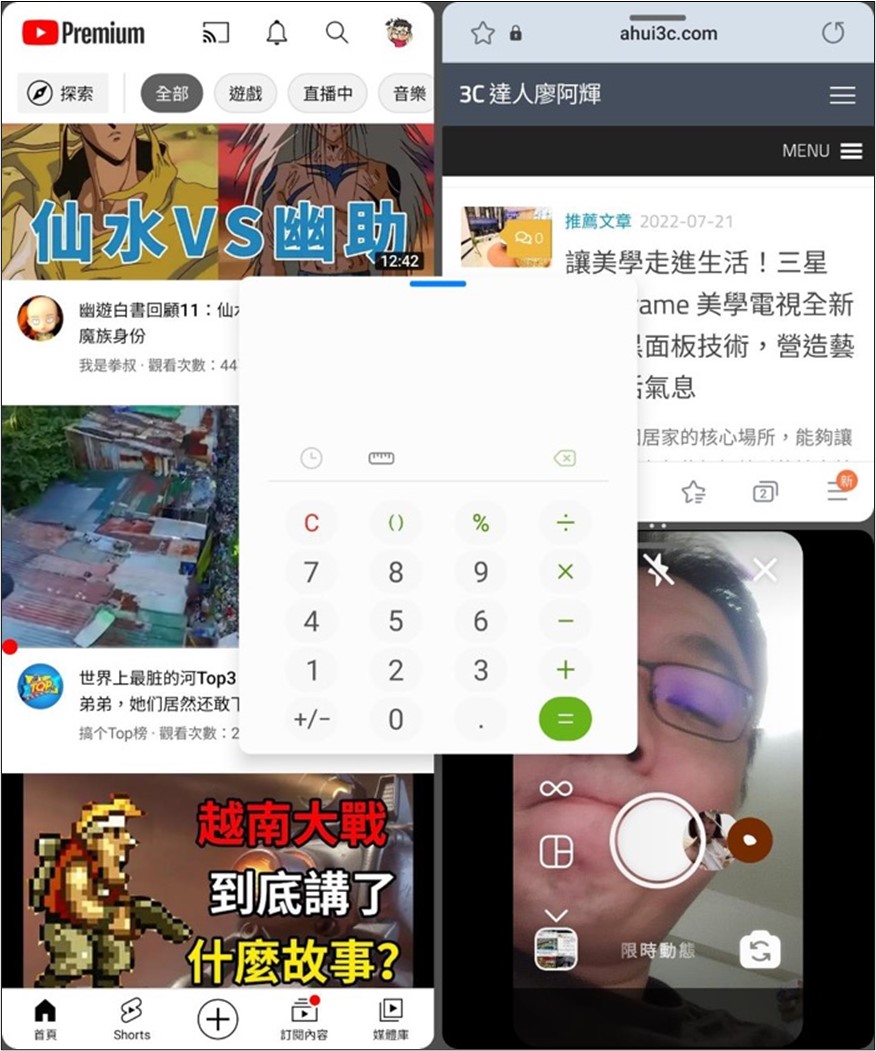 視窗分割其實可以最多到三個應用程式顯示,一個 1/2 螢幕,兩個 1/4 螢幕,再加上還可以執行一組浮動視窗程式,等於可以一次執行四個應用程式!