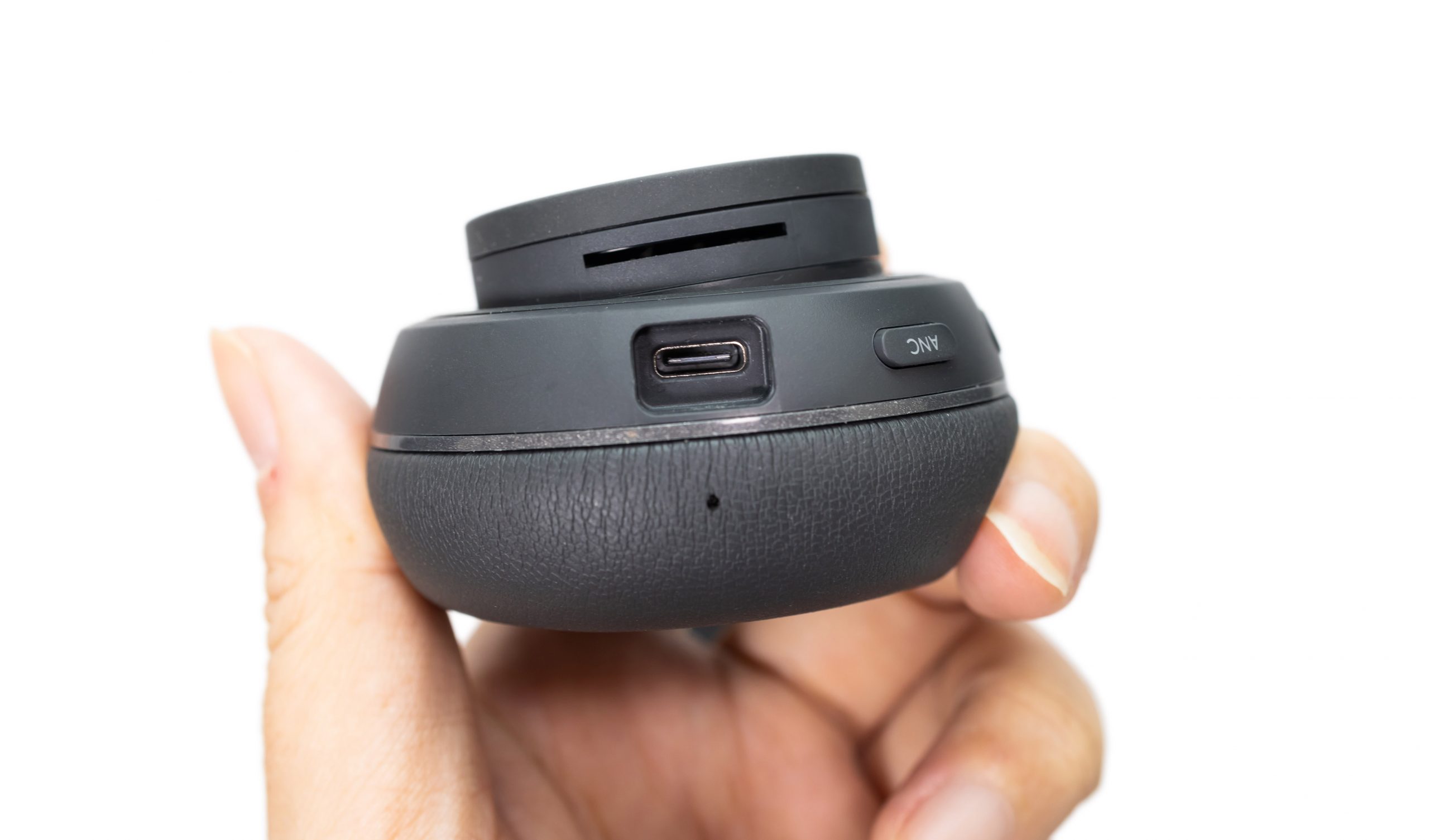 亦有支援有線的使用 Type-C 接口的充電選擇,習慣使用無線充電的人來說,放上充電盤就可以讓耳機充電,不必拔插線路也非常方便。有線充電的 Type-C 接口設置在另一個可以設定音量鍵的耳罩上,從這個角度也可以看到 ANC 主動降噪功能的開啟/關閉按鈕