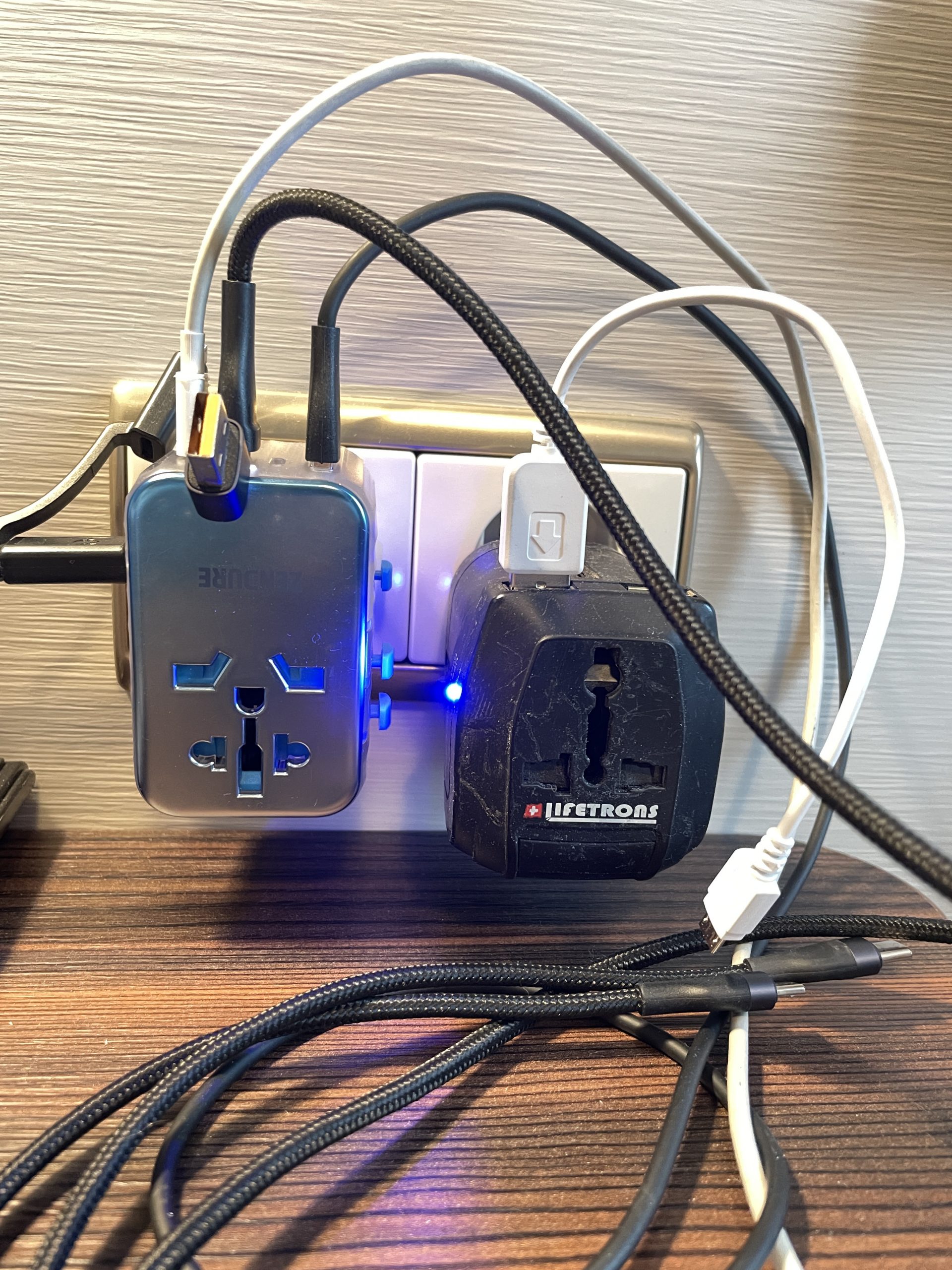 同行友人比較舊款的萬國充電頭就只有提供 2 個 USB-A 充電孔和延伸插座,也沒有提供快充輸出的電壓,充行動電源大概都要充整晚才有辦法處理好,效率相較之下就差非常多阿。