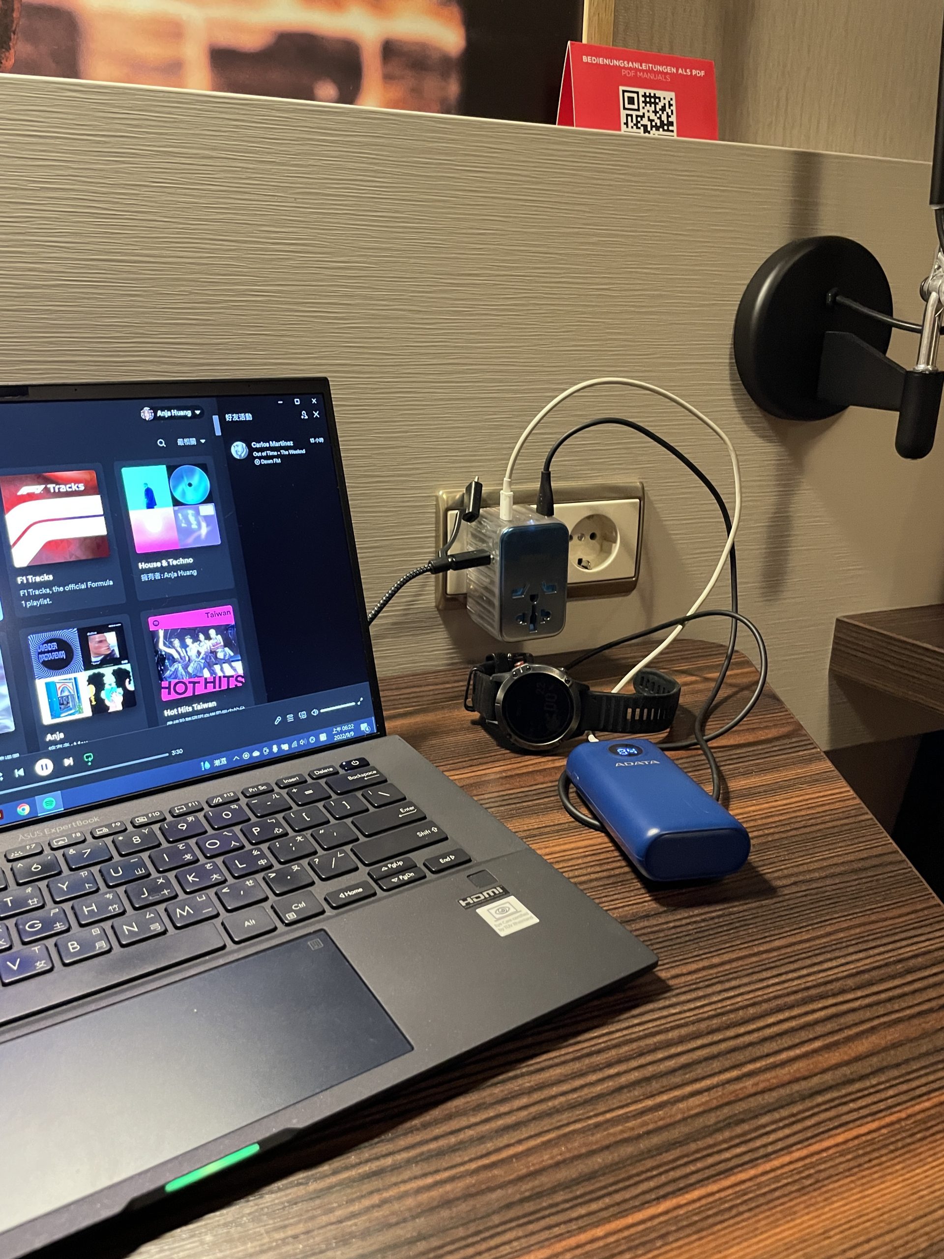 助理在飯店實測同時充筆電、行動電源和 Garmin 智慧手錶,其實一個人每天的基本裝備大概也就 3-4 樣,甚至還用不到擴充的延長線或充電頭。