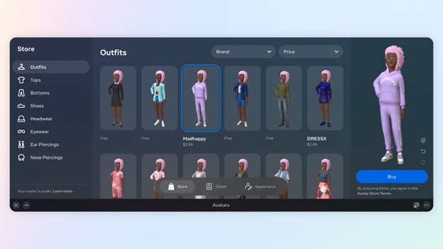 每個人的穿著也很重要。今天,Meta 宣布虛擬替身商店(Avatar Store)將於今年稍晚推出 VR 版。大家將可購買一些喜愛品牌的虛擬服飾,Meta 正在與體育、娛樂等領域的夥伴合作,讓大家找到適合個人風格的衣服。 Meta 期待帶動一個互通的數位商品市集——代表若大家買了一件毛衣,無論使用什麼 App,都可以將這件毛衣穿在虛擬替身上。