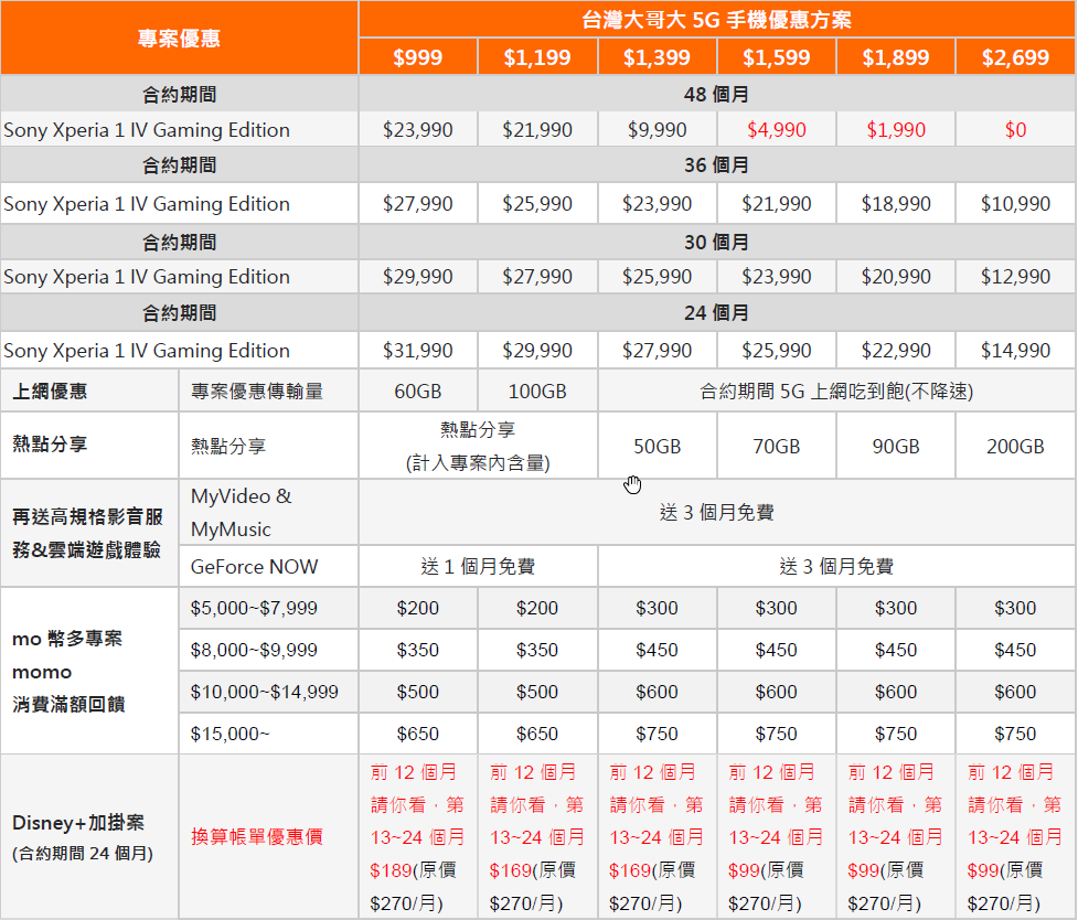 到台灣大申辦 Disney+指定專案購買 Sony Xperia 1 IV Gaming Edition,再享 Disney+首年請你看。台灣大用戶若為 momo 會員,申辦專案再享「mo 幣多」優惠,每月在 momo 購物網消費滿額,最高可獲得 750 元 momo 幣回饋。