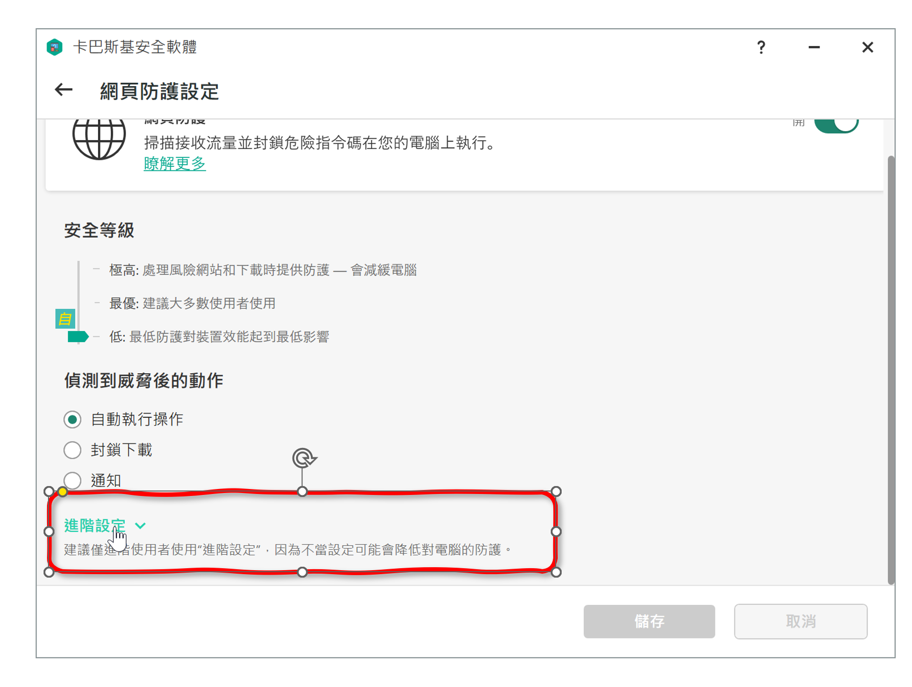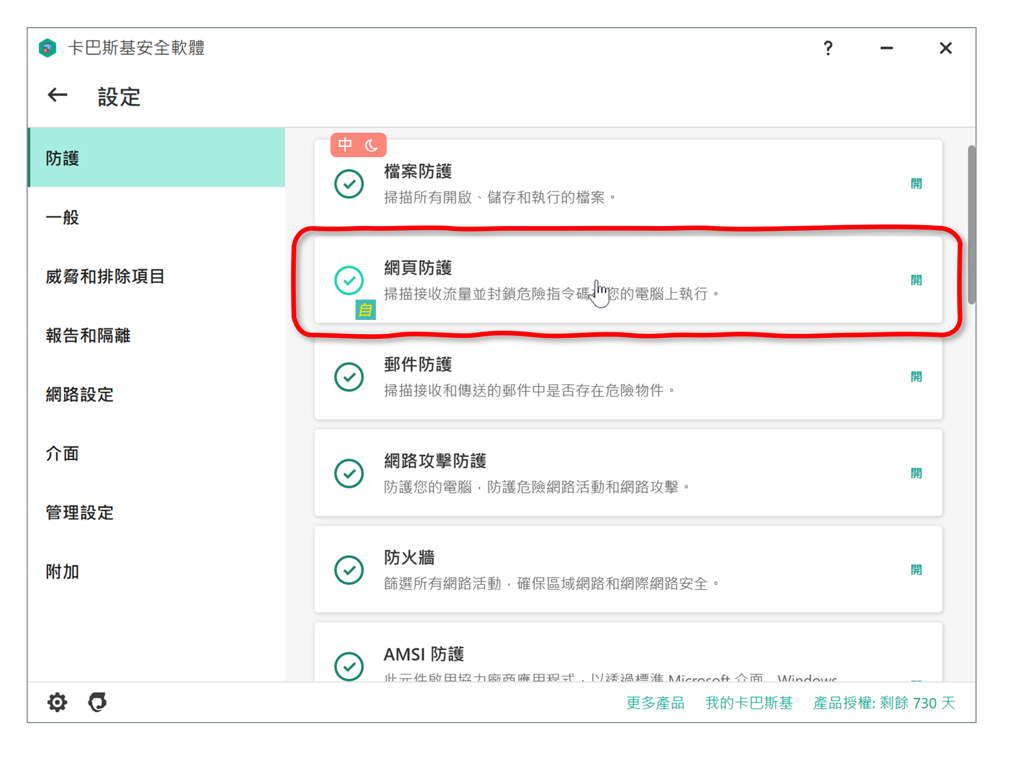 打開卡巴斯基安全軟體,進入『設定』後,點選『網頁防護』