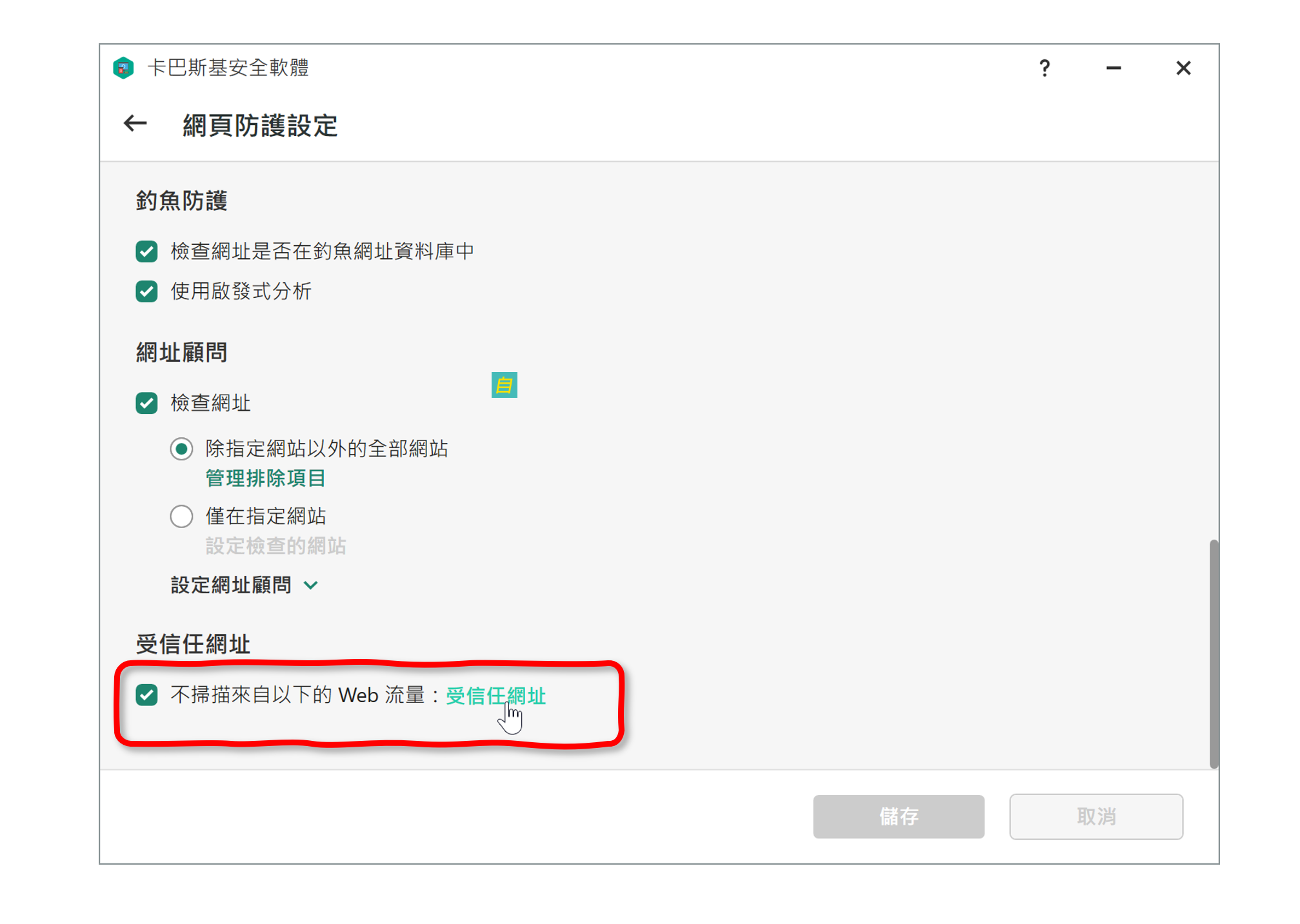確定有打勾『不掃描來自以下的 Web 流量,然後點選『受信任網址』