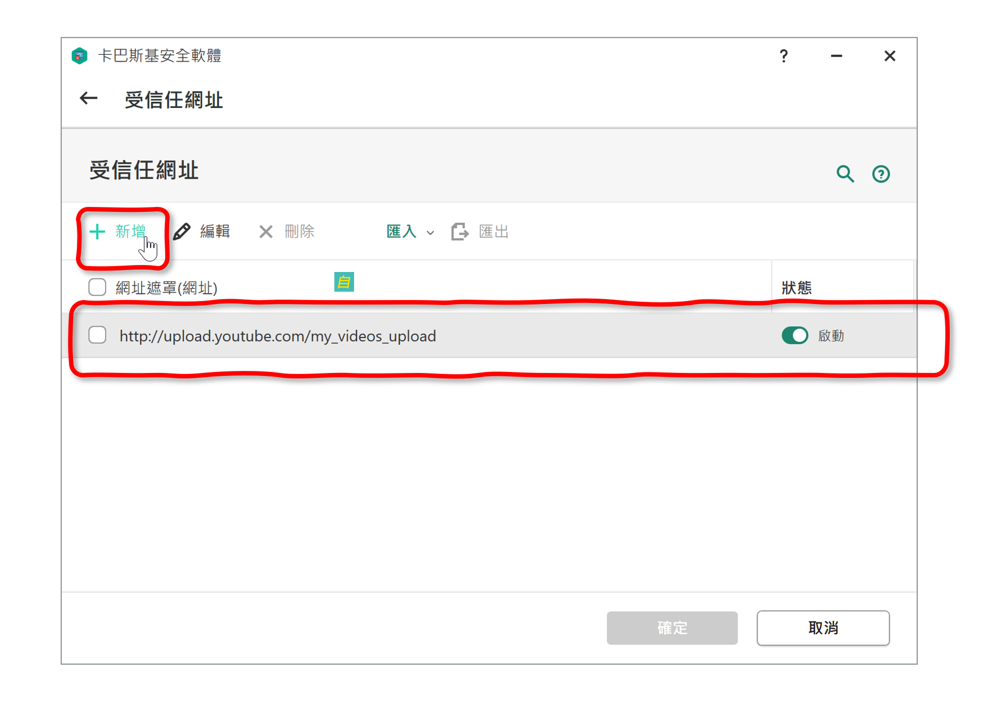 點選『新增』,網址輸入 http://upload.youtube.com/my_videos_upload,確定新增成功並且後面的啟動有選取