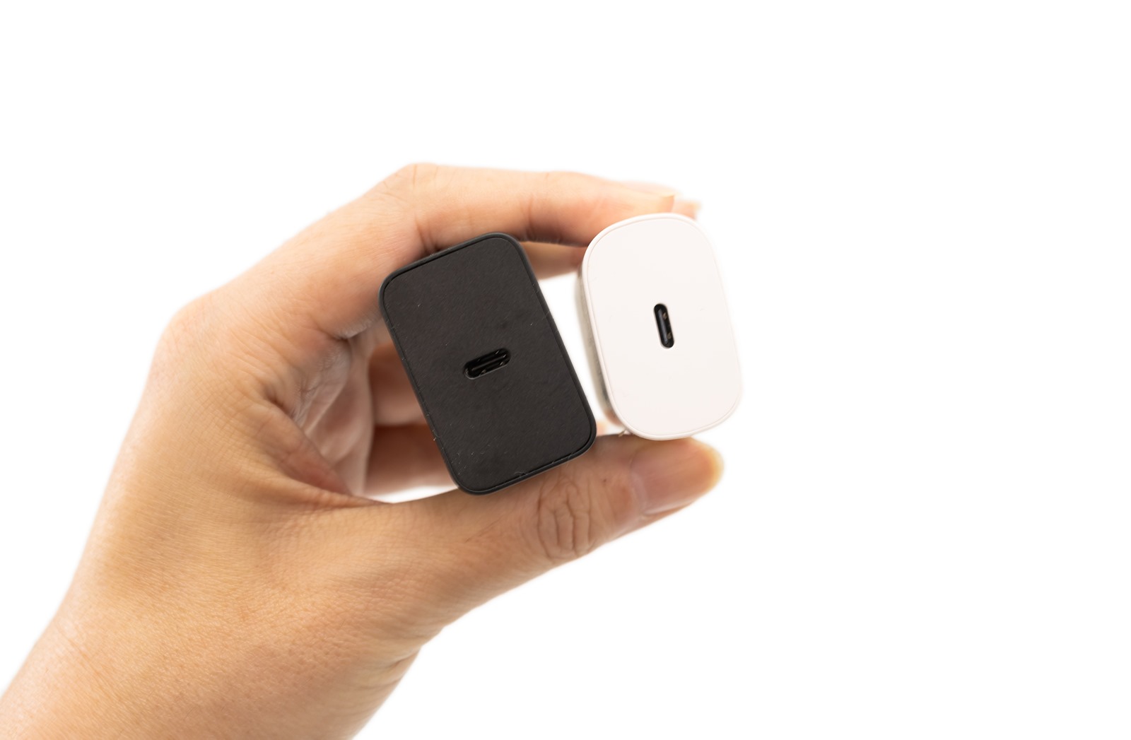 45W 充電器與 25W 充電器比一下大小,其實如果以大小來說 45W 充電器與 25W 充電器相比其實沒有差別很大(左邊為原廠 45W 充電器,右邊為 原廠 25W 充電器)