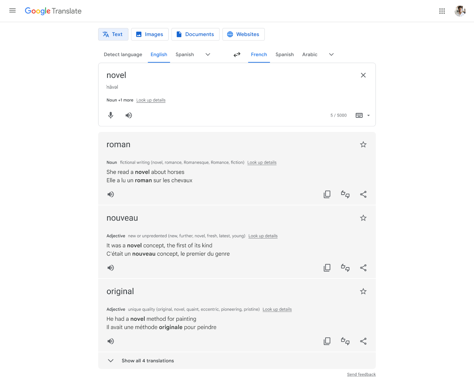 Google 翻譯能提供更多不同情境的翻譯選項。圖中示範為英文單字 Novel 進行法文翻譯