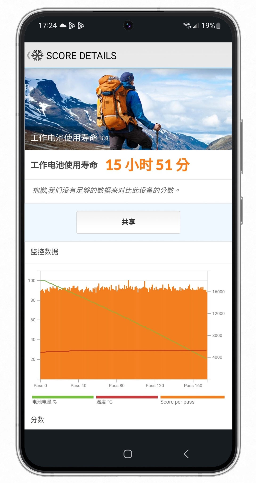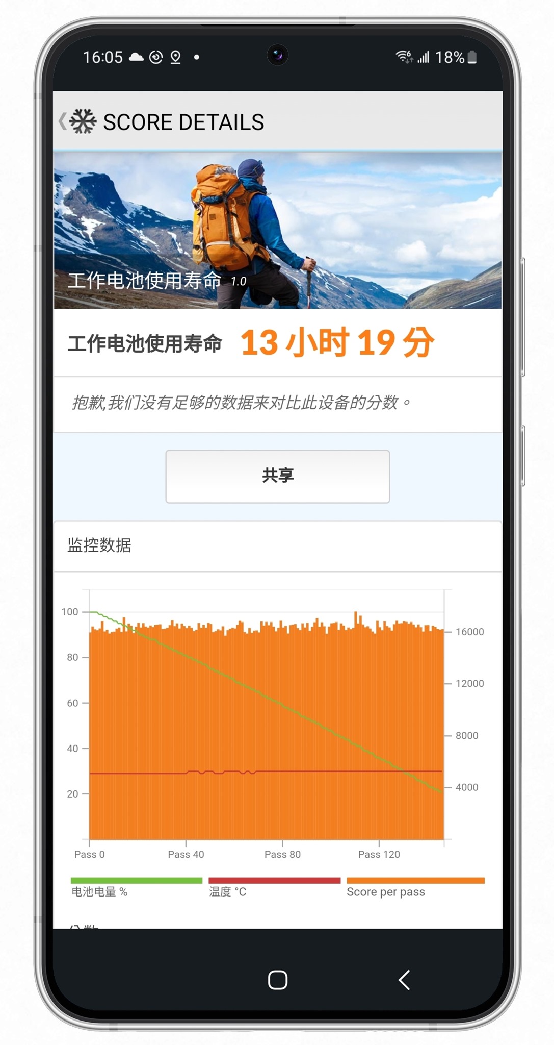續航電力測試 S23 機器內建電池容量為 3900 mAh,這裡實測電力部分以 PCMARK 做標準測試,以量測儀器固定統一亮度為 200nits,測試 80% ~ 20% 間的電力運行,模擬上網、工作、遊戲的混合應用,測試方式與標準可以參考這篇說明。