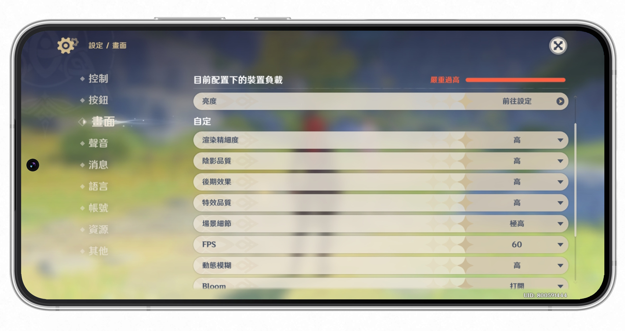 目前公認手機上前幾大高負載的大型遊戲原神,這裡阿輝直接設定最高的極高畫質並開啟 60 fps 模式來進行測試
