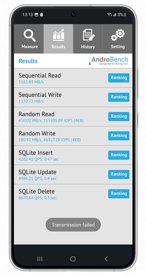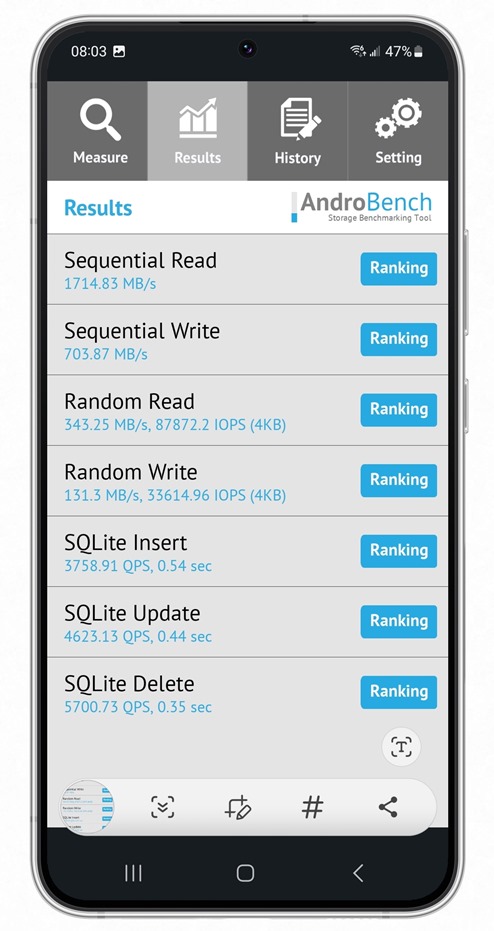 其實除了 CPU 處理器與記憶體,內建儲存空間的讀取/寫入速度也非常影響到日常使用的順暢度,這裡使用 AndroBench 實測讀寫速度