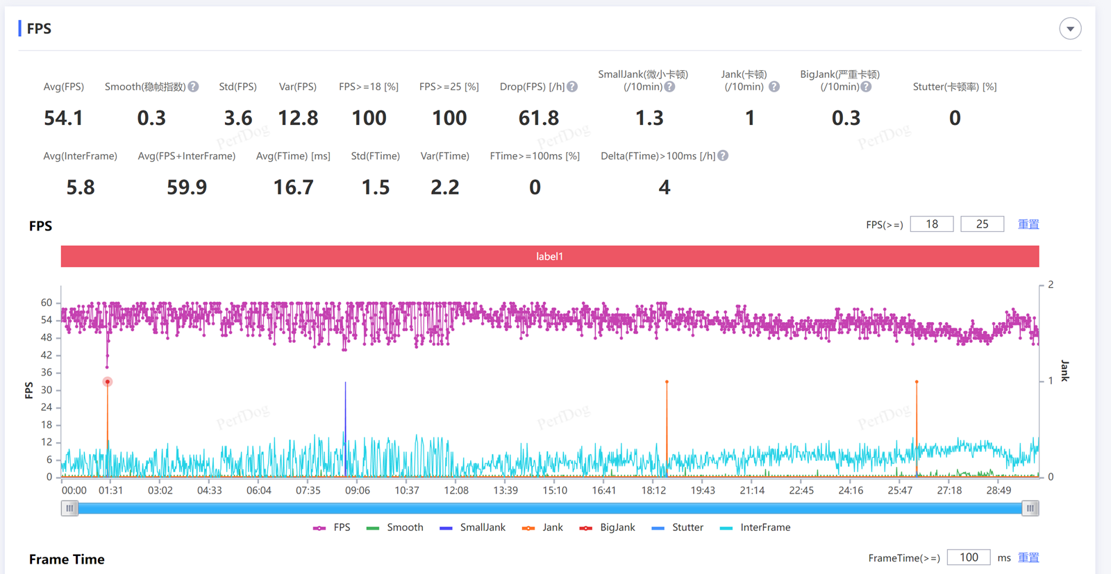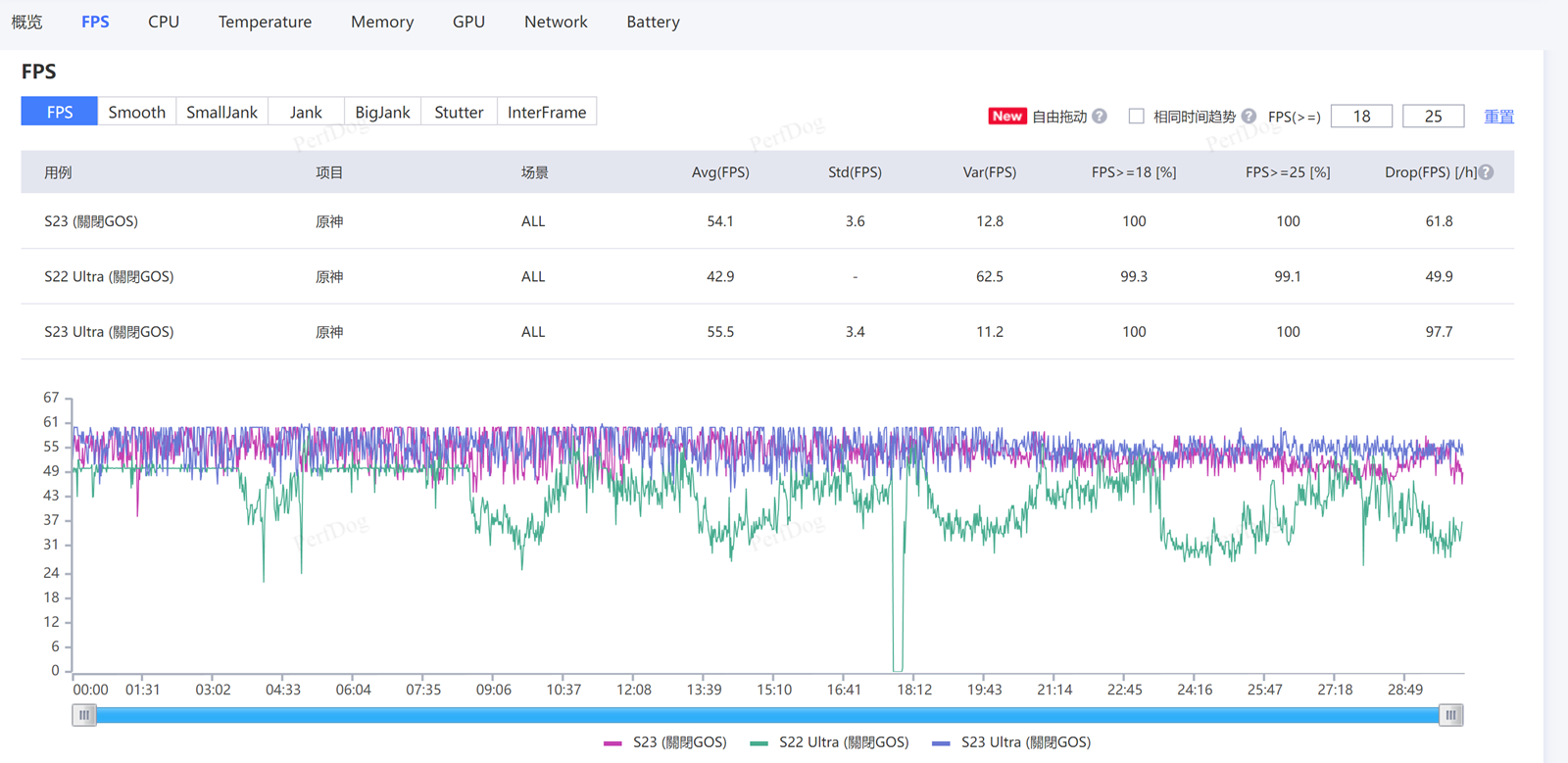 S23 關閉遊戲最佳化,原神極高畫質 + 60 fps 測試可以跑出 30 分鐘平均 54.1 fps 的成績
