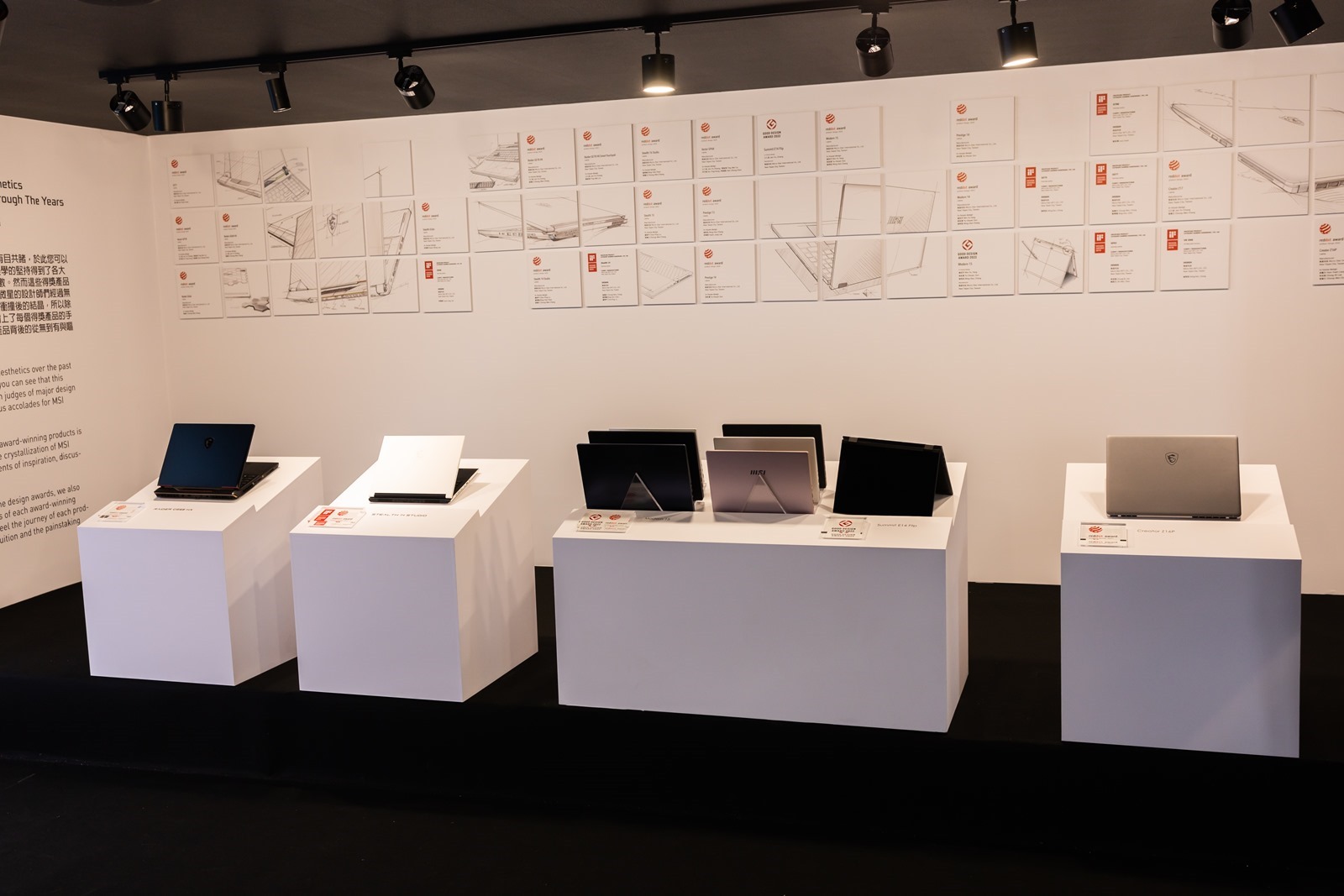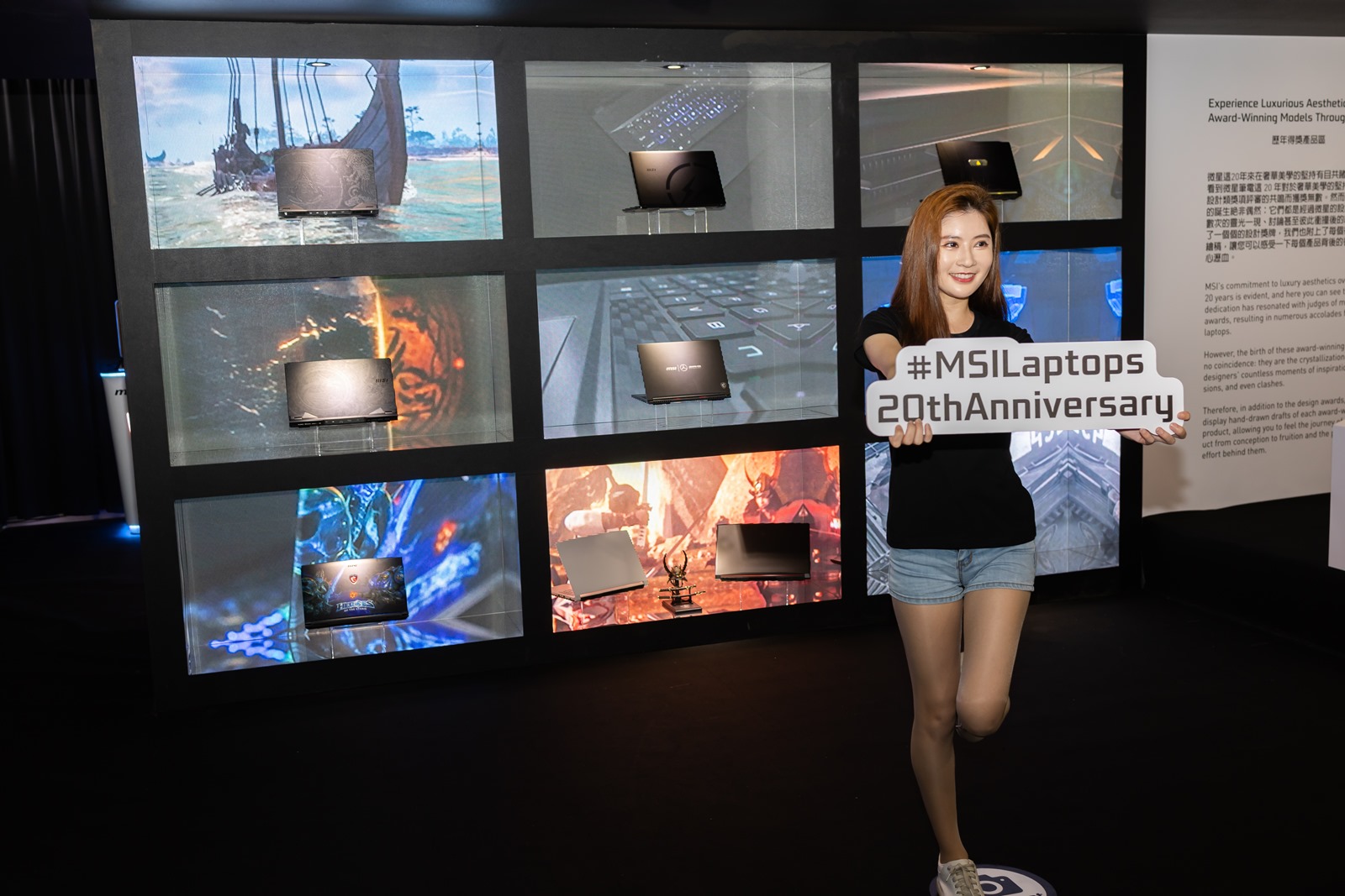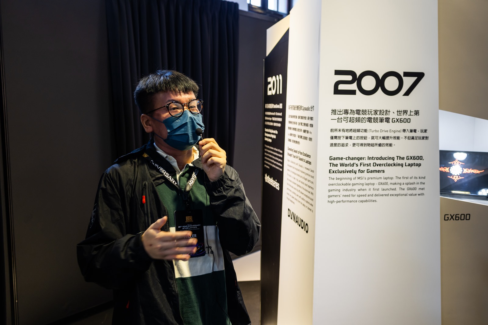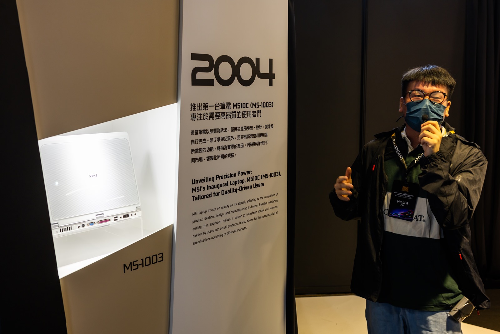 會場入場後先是大螢幕會播放大約 6 分鐘的短片介紹微星的成立與發展歷程,接就是微星筆電 20 週年的時光走廊,從 2004 微星推出第一台筆電開始,以展櫃方式介紹各個重要的歷史里程碑,很棒的是特殊技術/機型現場甚至有展出實機,其中很多機器阿輝都曾經使用或是擁有過真是充滿非常多回憶啊~