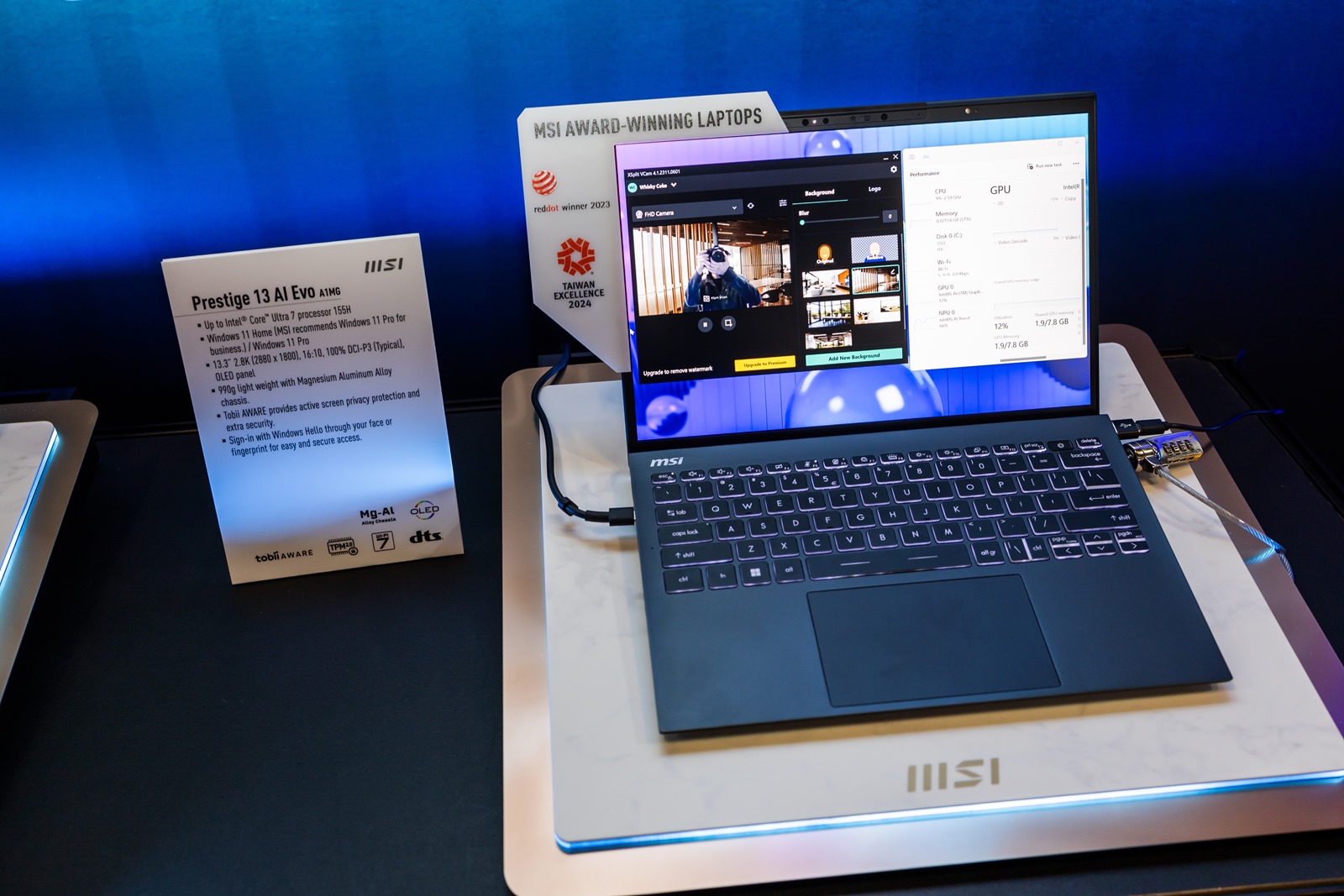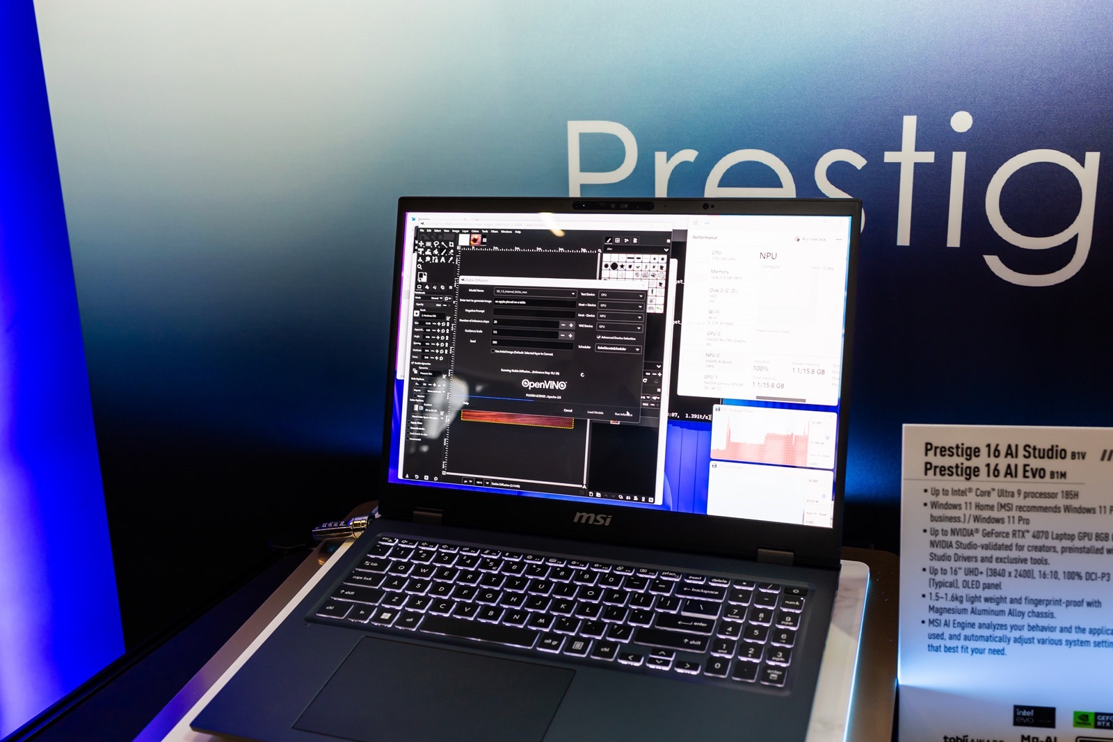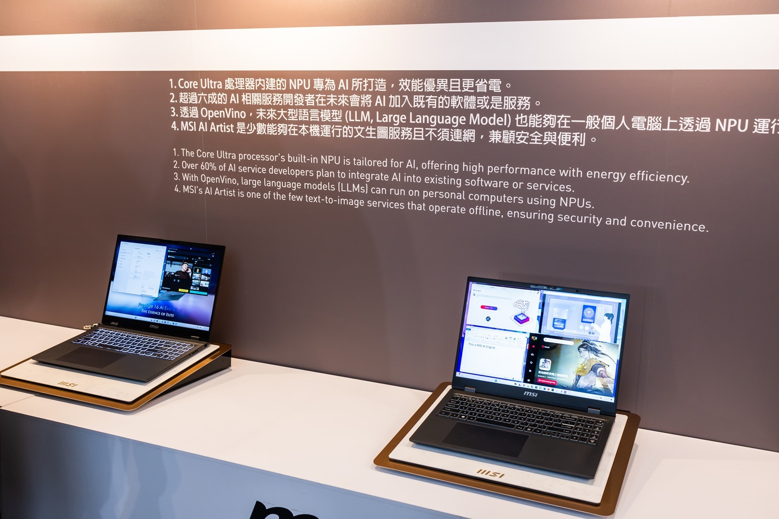對於最新的 AI 技術,因為 Intel 最大的新產品線 Core Ultra 就是將 NPU 加入了處理器當中,可以說是專為 AI 特別強化帶入了個人電腦中,微星現場也展出多台未來將搭載 Intel Core Ultra 處理器的筆電產品,並示範各種 AI 應用,當然最常見的 AI 繪圖、自然語意分析都可看見現在連輕薄筆電都可以輕鬆使用 AI 的這未來新趨勢