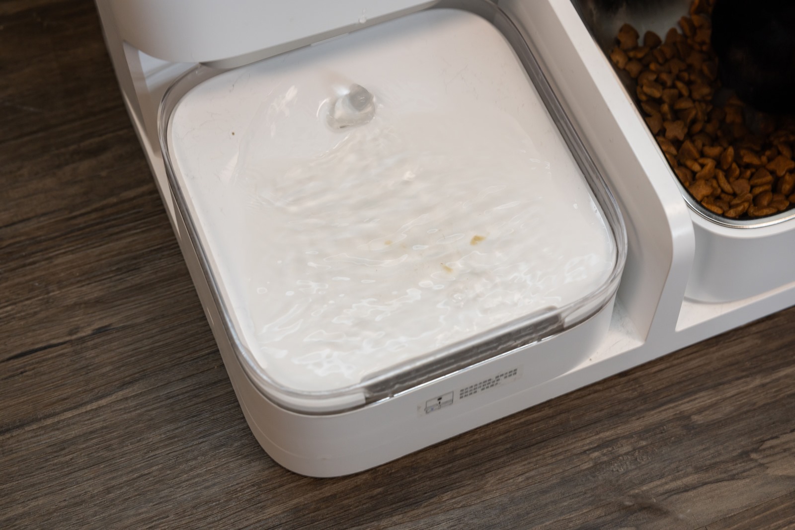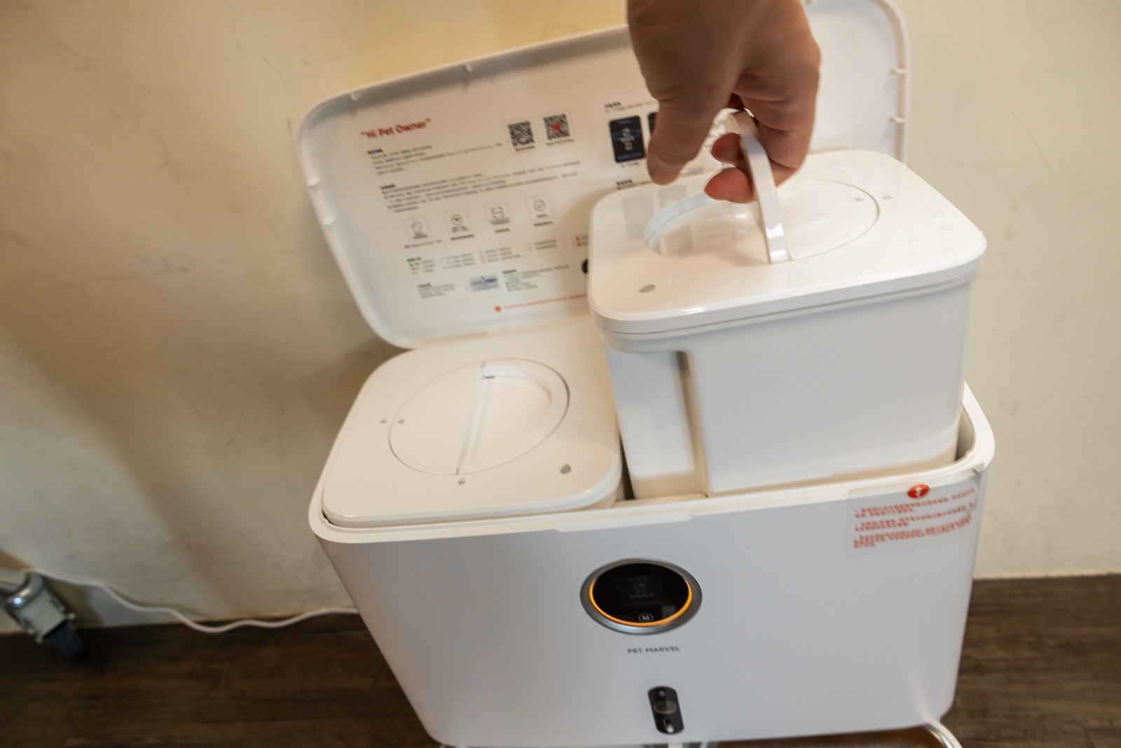 跟掃地機器人底座很像的設計?!(笑)但真的超方便,上蓋打開就可以向上提出乾淨水桶/污水桶/飼料桶,無論是換水或是補乾乾都更方便輕鬆,不用彎腰低頭處理腰酸背痛,換水時避免了傳統喝水器容易水濺出來的困擾