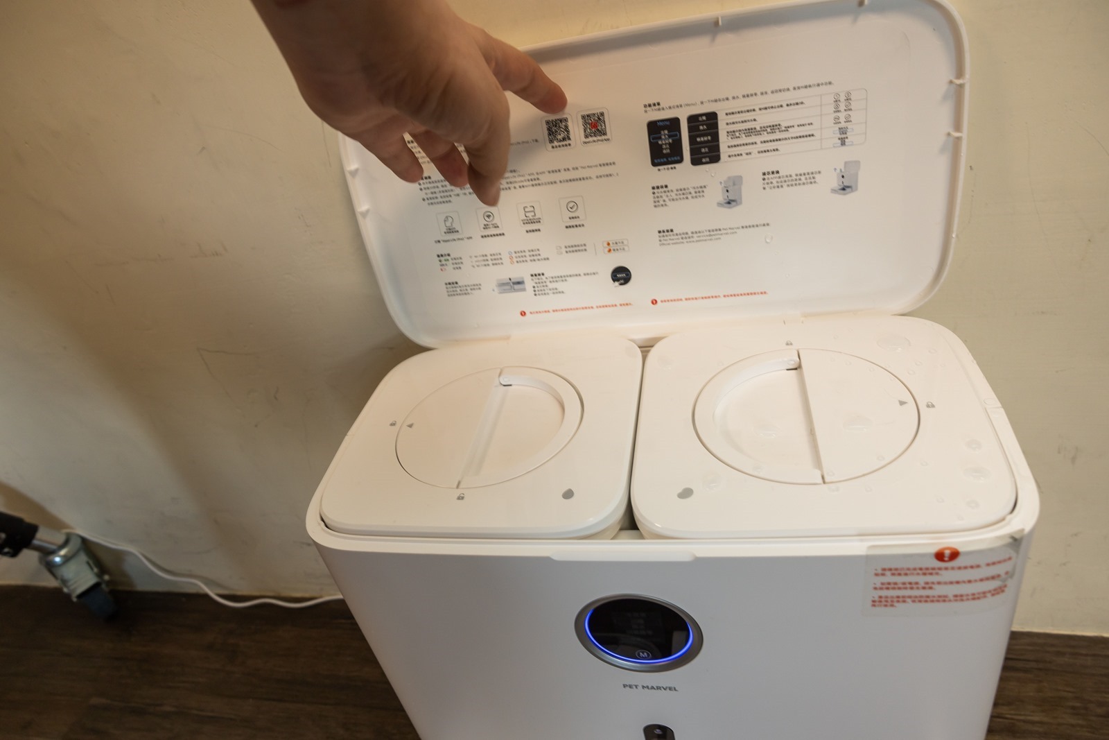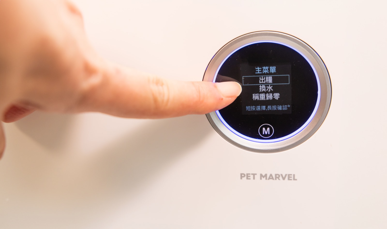 除了自動餵食之外,如果臨時要再加餵,只要在機器的圓形螢幕上直接操作就可以,完全不用擔心