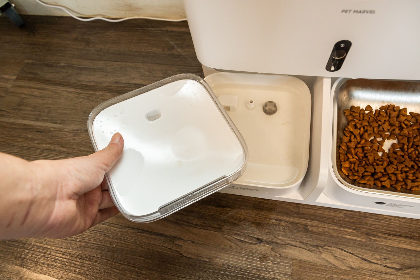 除了換水桶與飼料桶可以直接提起更換之外, Pet Marvel 寵物餵食飲水機器人的水碗與飯碗都是分離可拆洗,這也是非常方便的設計,不用為了要清洗水碗就整台機器需要辛苦的搬動
