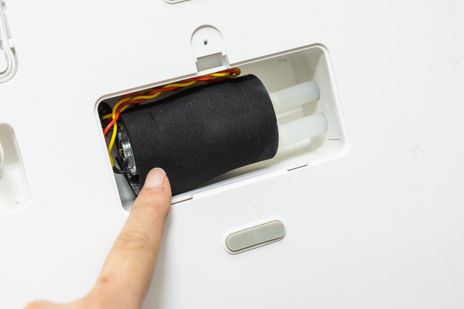 供電的變壓器線材有採用防咬的編織包覆,連接處也隱藏在機器底部並有非常牢靠的固定,可以很大程度避免線材脫落的情況,同時 寵物餵食飲水機器人也有內建備用電源設計
