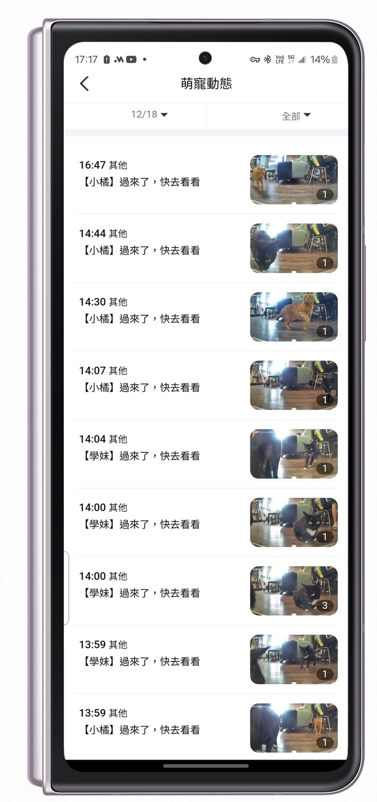 APP 也會自動記錄靠近/喝水/吃乾乾的影片,一個功能當然是輔助記錄貓貓狗狗的喝水吃飯,另外說實在的如果常常不在家的寵物主人,打開手機就可以看到每天家中貓咪狗兒子的身影,真的也是挺療癒的一個小功能