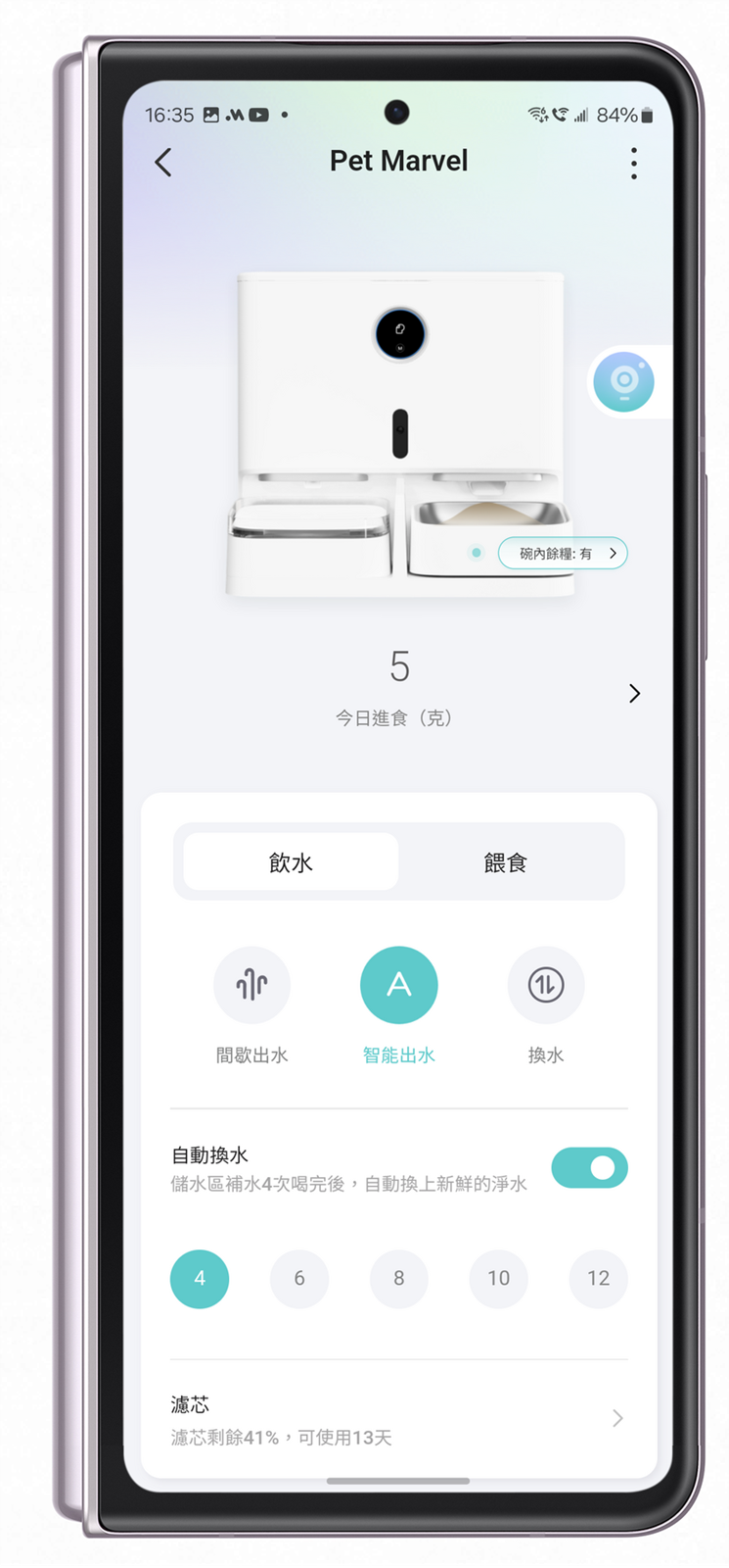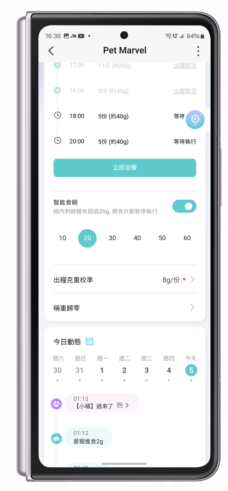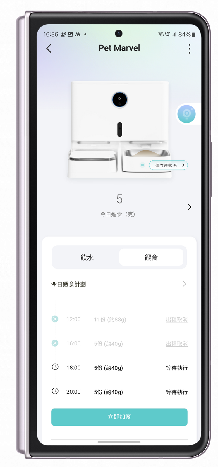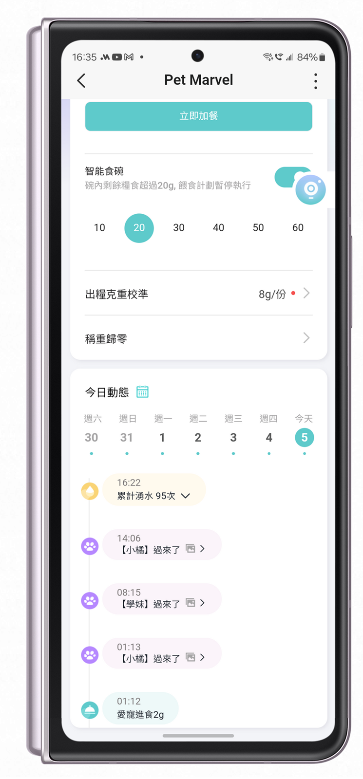 自動產生餵食記錄並且配合可以貓臉辨識記錄每隻貓咪狗狗吃了多少 g 乾乾飼料,並且配合具備 Pet Marvel 寵物餵食飲水機器人功能的貓糧碗,及時偵測碗內剩餘數量也會調整出糧的數量,不會造成過於堆積的情況;當然這功能也可以在 APP 中調整,碰到像是非得吃脆脆乾糧的貓咪狗狗也可以依照需求來調整