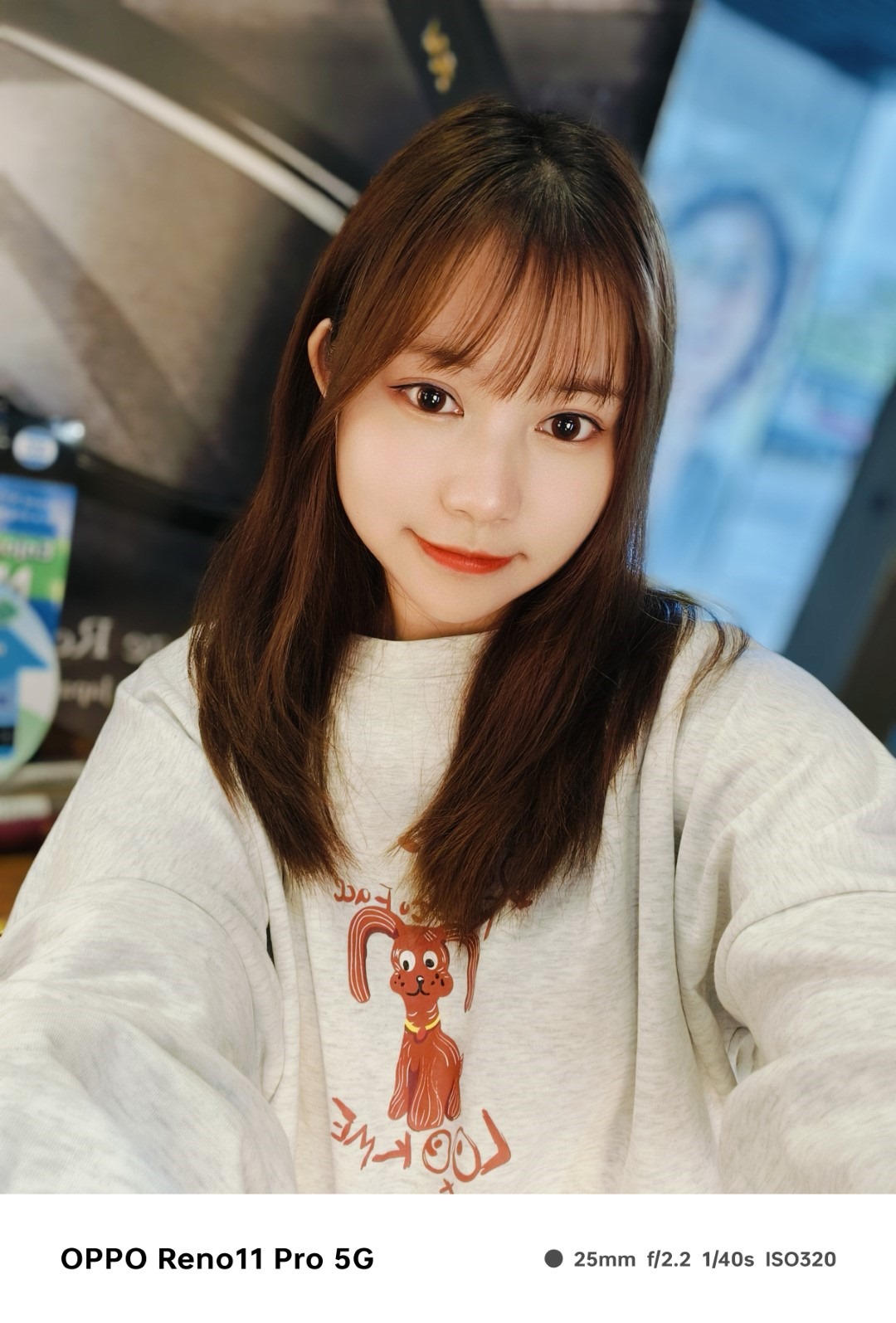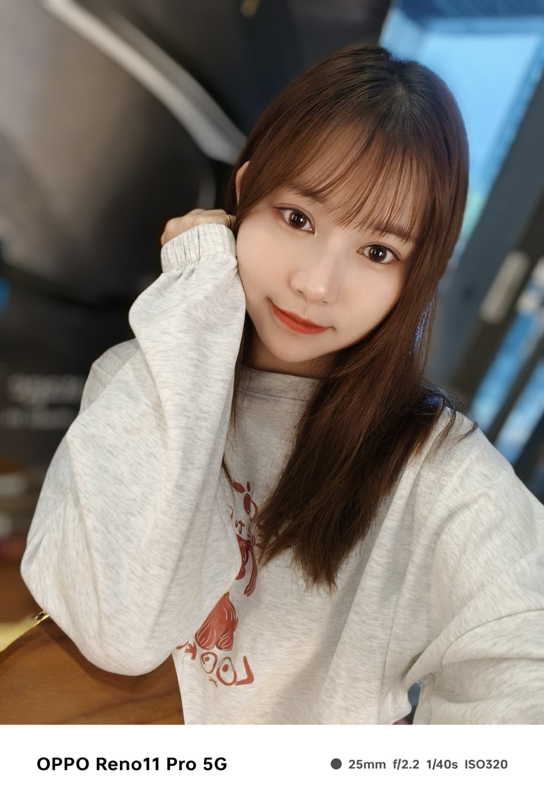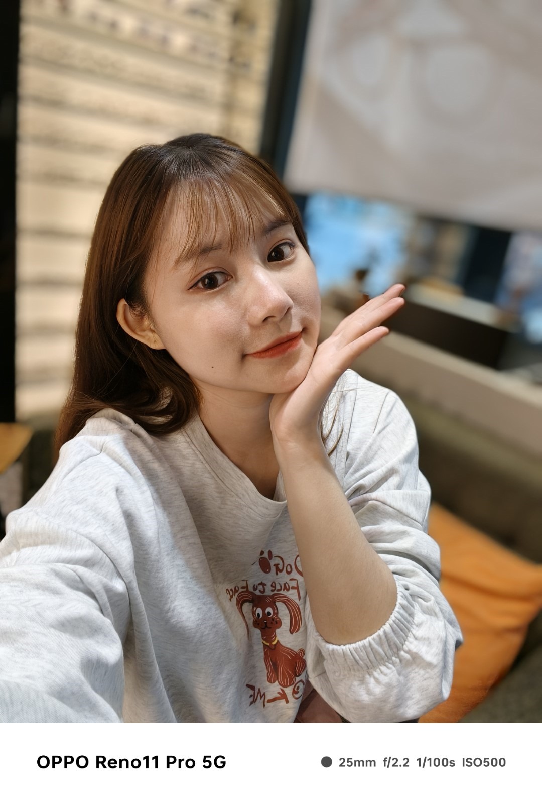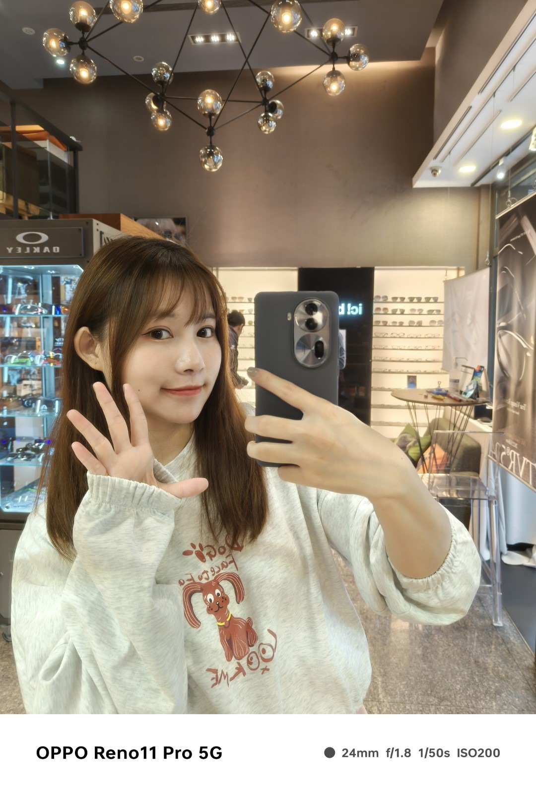 自拍 OPPO 當然就是讚!OPPO Reno11 Pro 與 OPPO Reno11 自拍方面都是用 3200 萬像素 f/2.4 光圈並,且 Reno11 Pro 還支援 AF 自動對焦,這裡也請合作妹子自拍給大家參考。