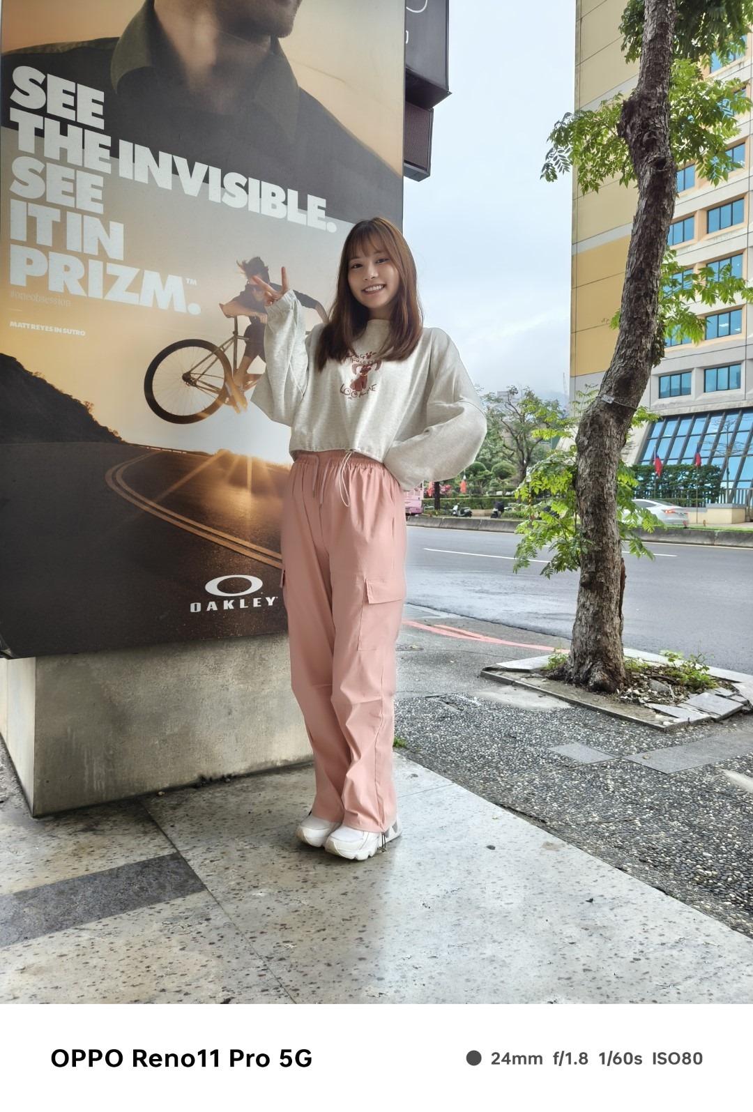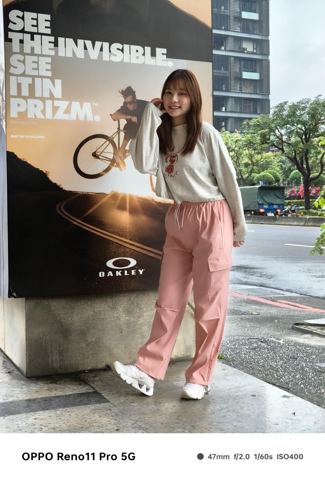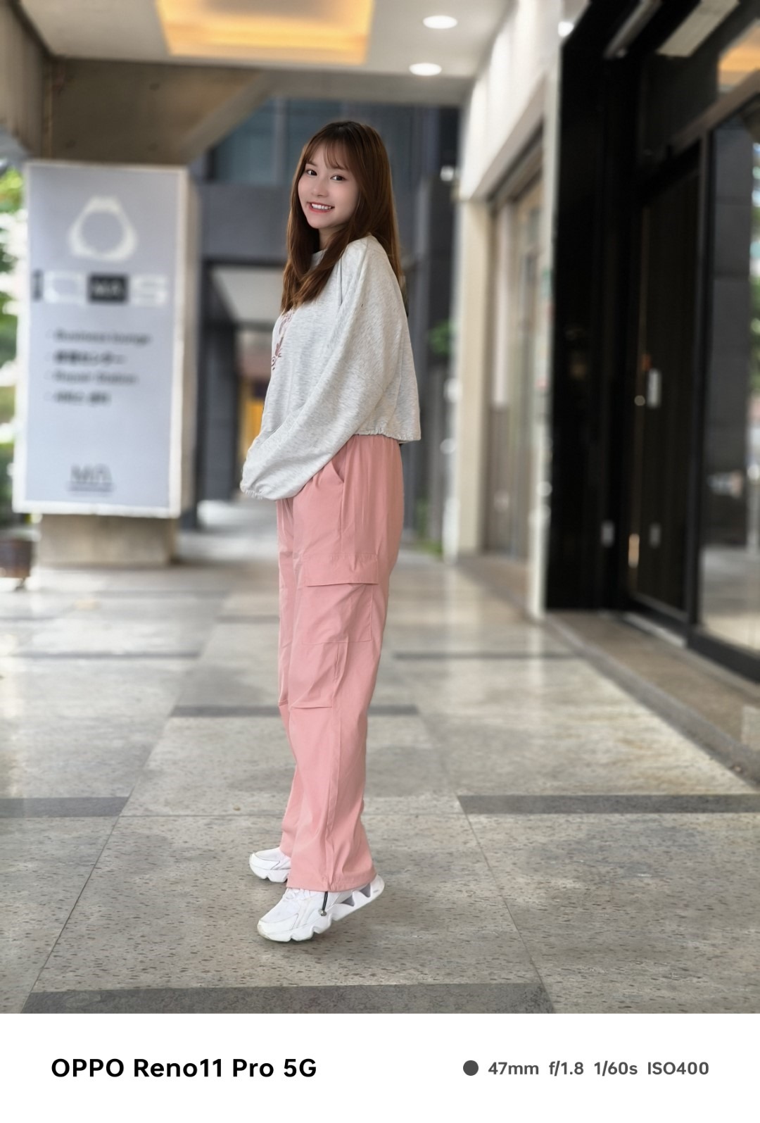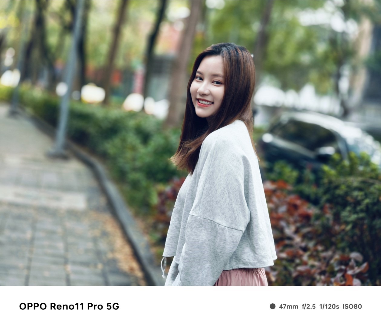 儘管現在很多手機都強調主鏡頭高相素可以提供 2x 無損變焦,不過長焦鏡頭就是長焦鏡頭,『真實的望遠鏡頭景深壓縮效果』是主鏡頭裁切鏡頭所沒有的,這裡可以參考阿輝拍攝人像的實拍,人像拍攝部分 Reno11 Pro 照例請正妹協助拍攝和大家分享效果,Reno11 Pro 這樣 2x 等效 47mm 焦段 + 大光圈的望遠鏡頭,無論真實景深還是焦段的壓縮感都是截然不同的表現,而且這個焦段在專業攝影中被稱為黃金焦段,能夠拍出最接近人眼所見、不容易變形的人像。