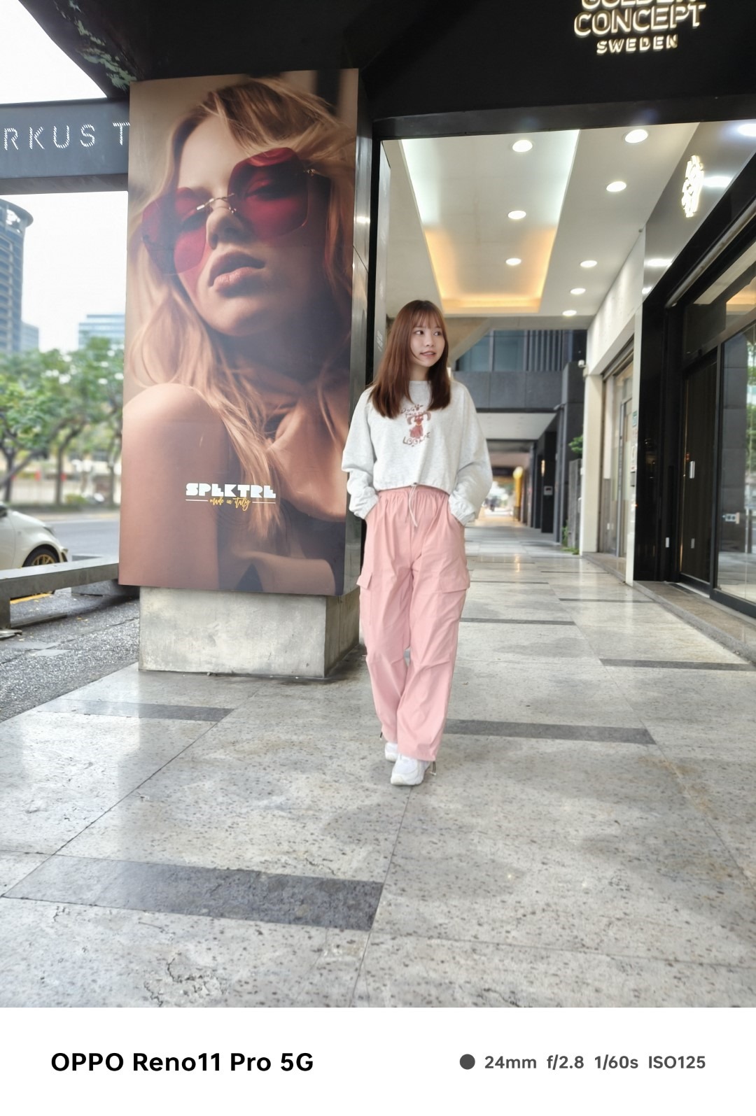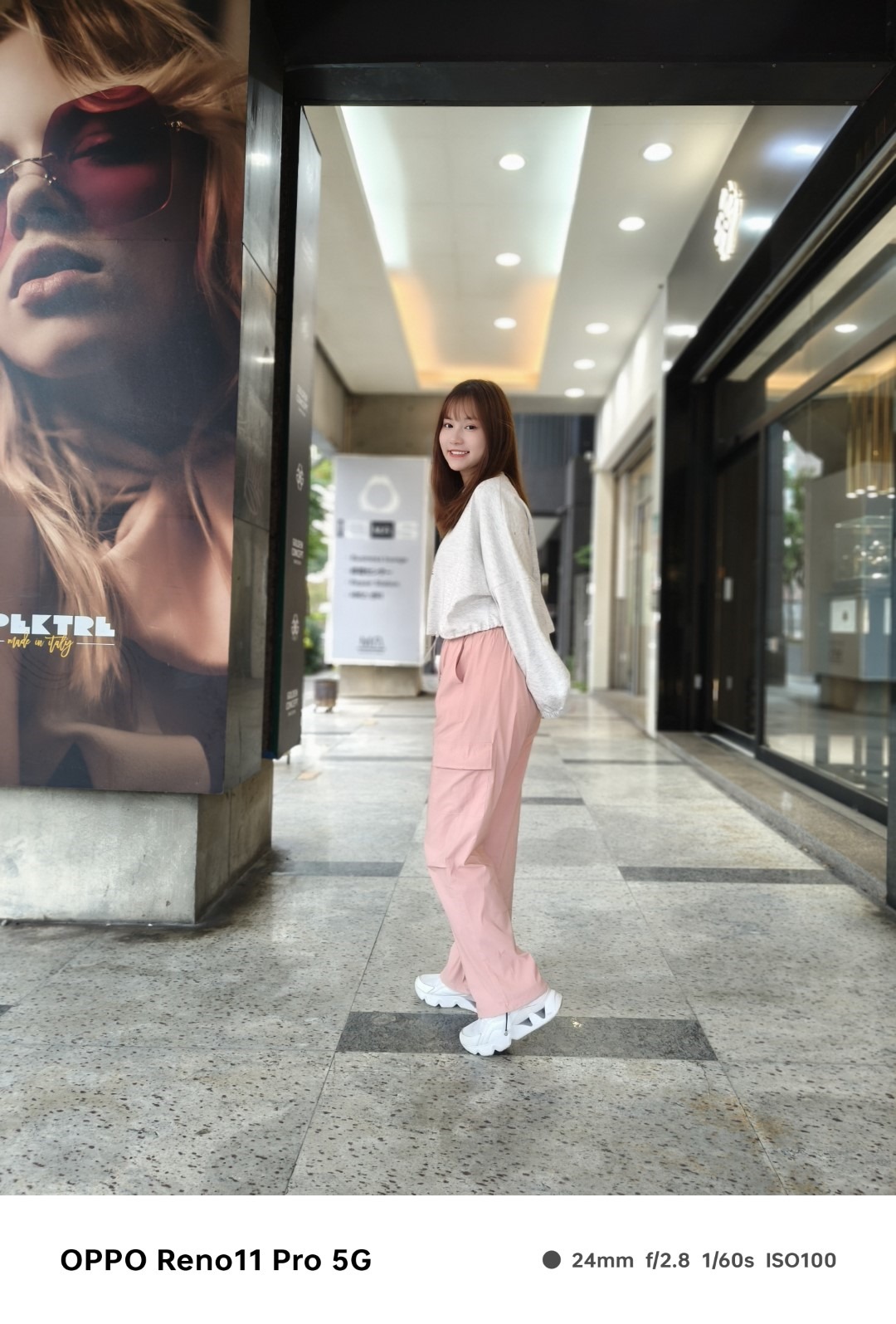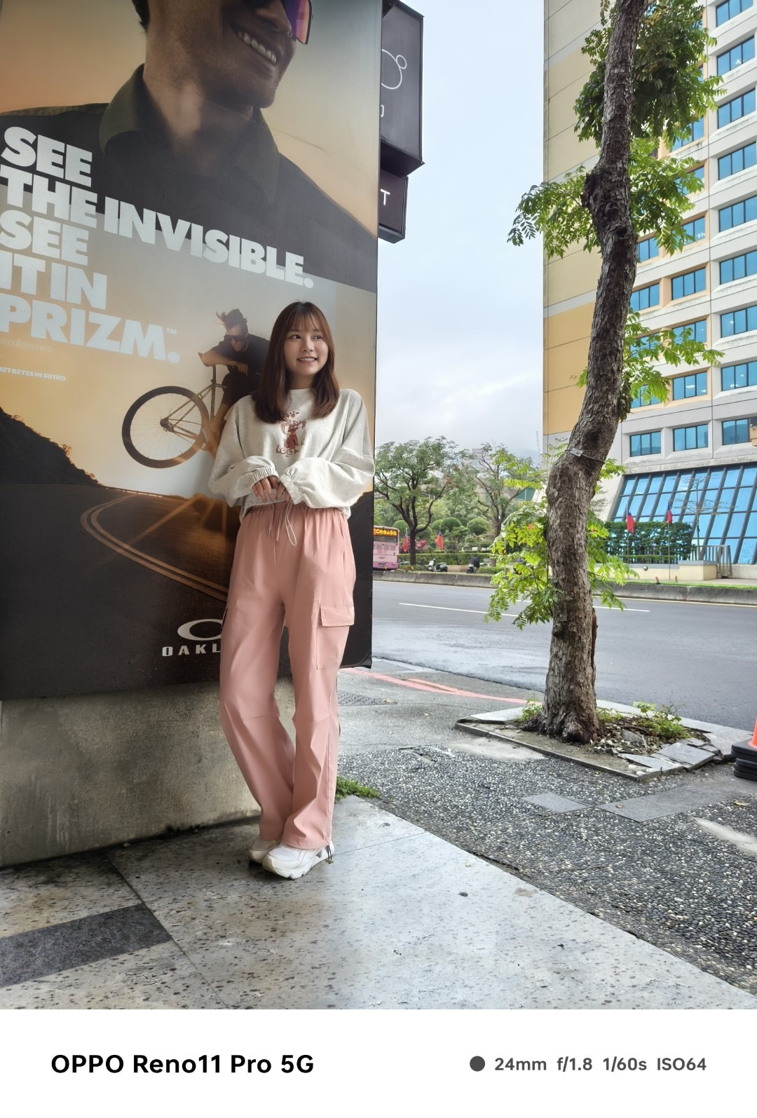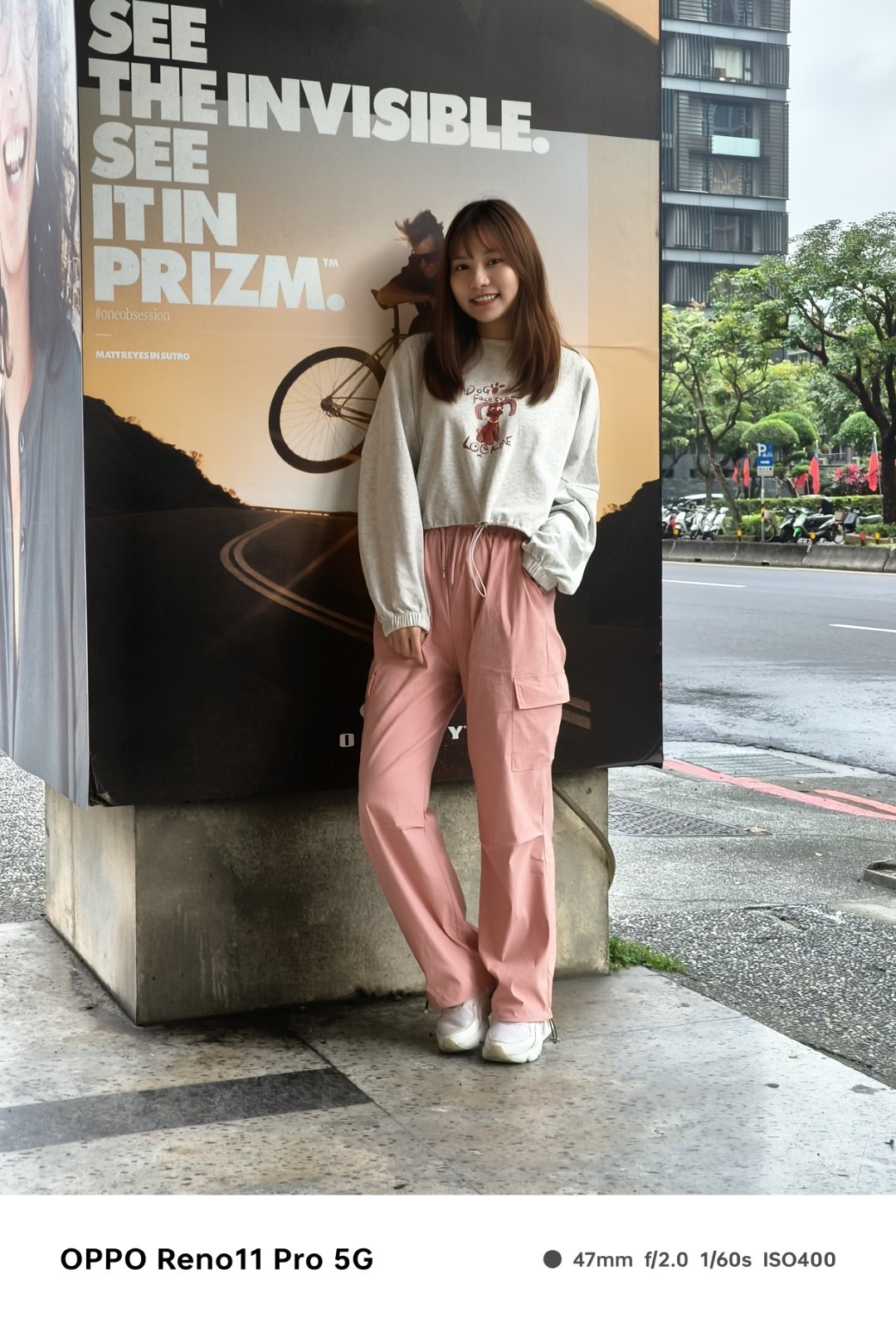 儘管現在很多手機都強調主鏡頭高相素可以提供 2x 無損變焦,不過長焦鏡頭就是長焦鏡頭,『真實的望遠鏡頭景深壓縮效果』是主鏡頭裁切鏡頭所沒有的,這裡可以參考阿輝拍攝人像的實拍,人像拍攝部分 Reno11 Pro 照例請正妹協助拍攝和大家分享效果,Reno11 Pro 這樣 2x 等效 47mm 焦段 + 大光圈的望遠鏡頭,無論真實景深還是焦段的壓縮感都是截然不同的表現,而且這個焦段在專業攝影中被稱為黃金焦段,能夠拍出最接近人眼所見、不容易變形的人像。