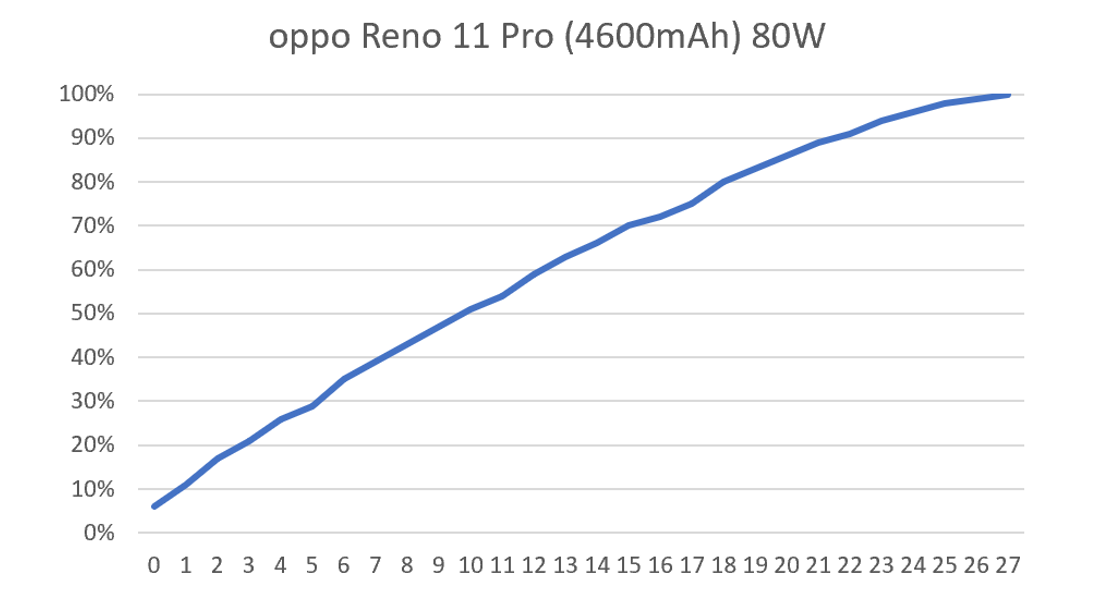 Reno11Pro 充電部份支援 80W 充電,這裡我們將機器消耗到自動關機,接上原廠充電器與原廠線材開機充電(待機狀態),並觀察紀錄充電實際的速度與時間,Reno11 Pro 充電部分在台灣可以完整觸發 80W 快充沒有問題,實測充電 10 分鐘可達 49%,0~100% 只要大約 27 分鐘