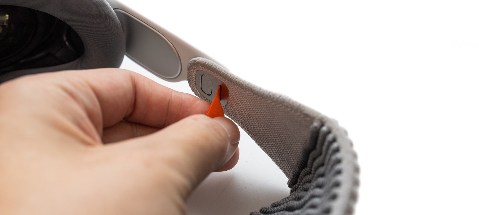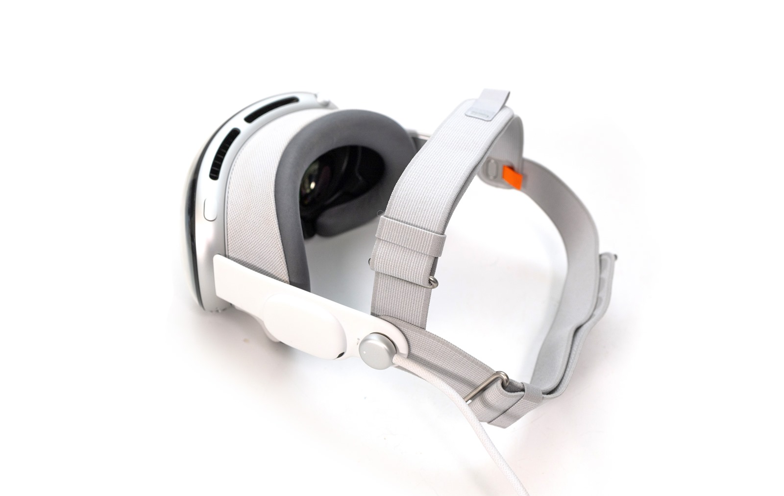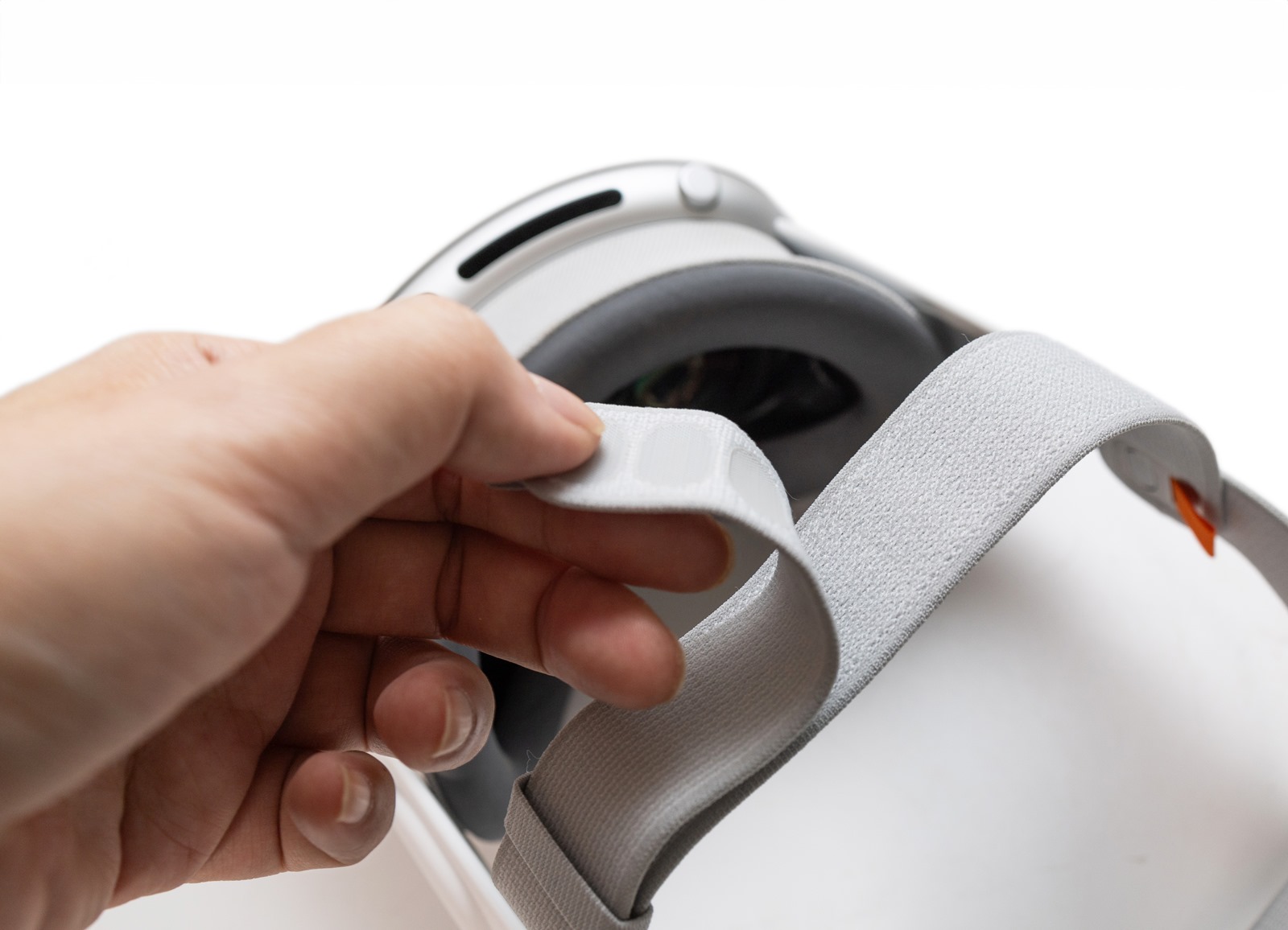 雙頭戴有頂部支撐,安裝時要注意上下位置(出貨標配兩種頭戴都有附上,可以依照需求自己更換使用),另外每一組 Vision Pro 在下單時候都會偵測購買者的頭型與大小,因此你如果是試玩其他人的機器,可能頭戴會有不合適的情況,頭較小的朋友可在後面頭戴部分塞些擦拭布的方式協助固定,因為眼控操作的特性,需要配戴正確避免影響操作