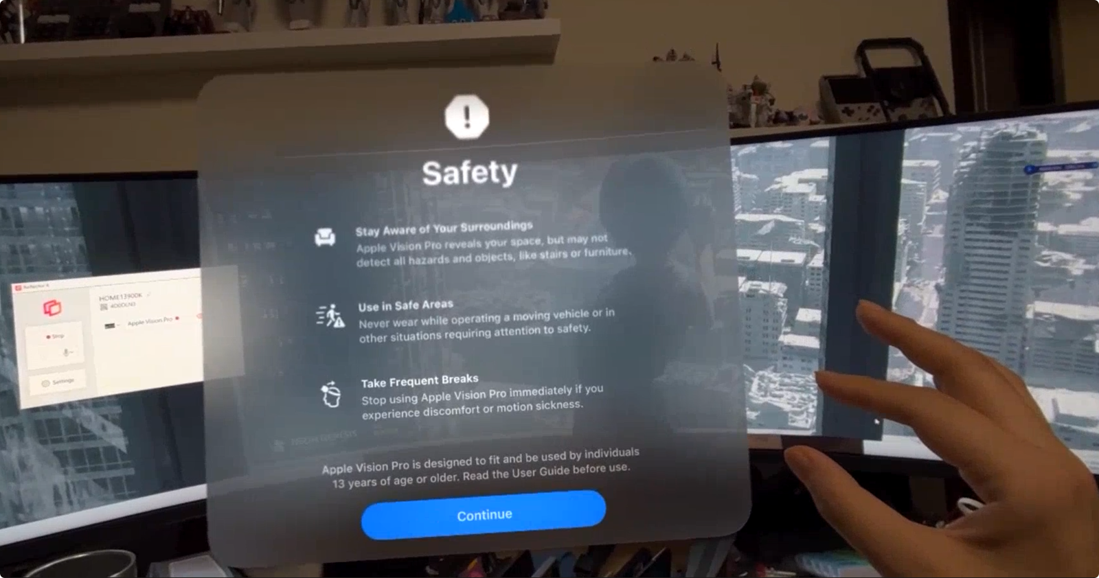 校正後會有安全使用提醒,請眼睛看向下方 Contiue 按鈕,然後捏一下確定就完成校正了;另外阿輝介紹手會伸的比較高,不過其實實際上不用舉高,大致上你手放在肚子甚至是腿上,Vision Pro 都能抓到你的捏合動作