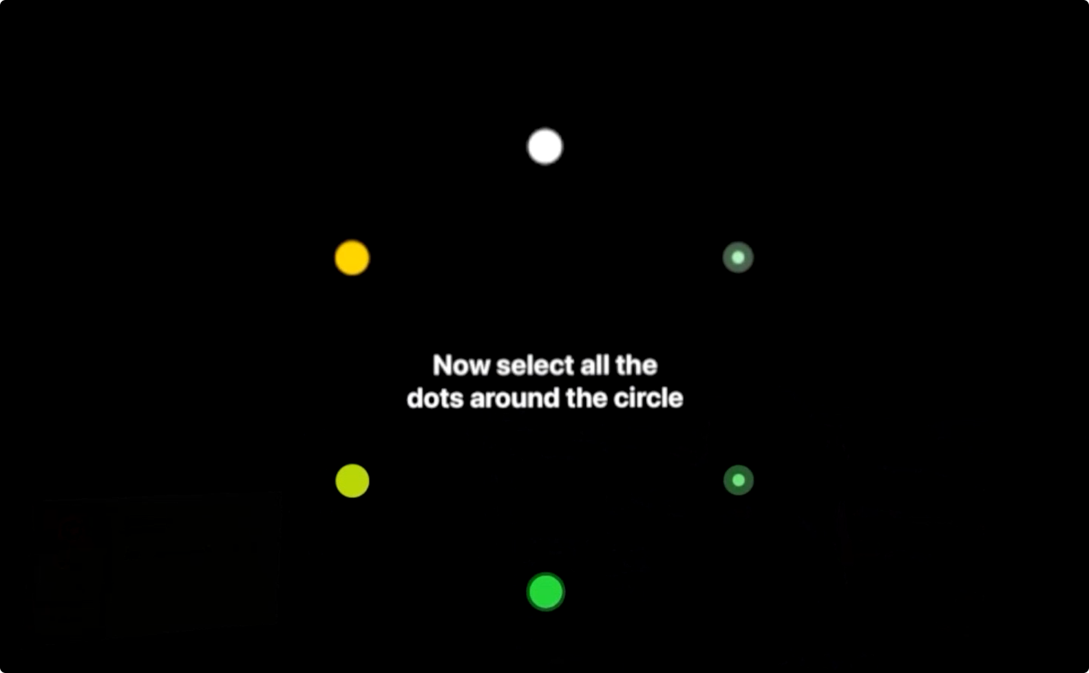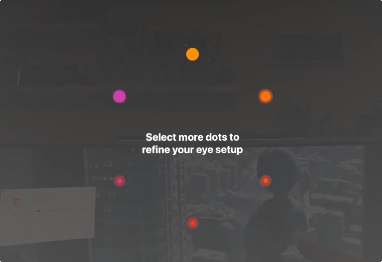 基本上眼睛校正就是眼球看畫面上的圓點做確認,請移動你的眼球一次看一個圓點,注視後會變小點,然後手指捏一下,注意不要捏住不放,就是乾淨俐落『捏一下』就好,你也可以想像眼睛就是你的滑鼠游標,捏一下就是滑鼠左鍵