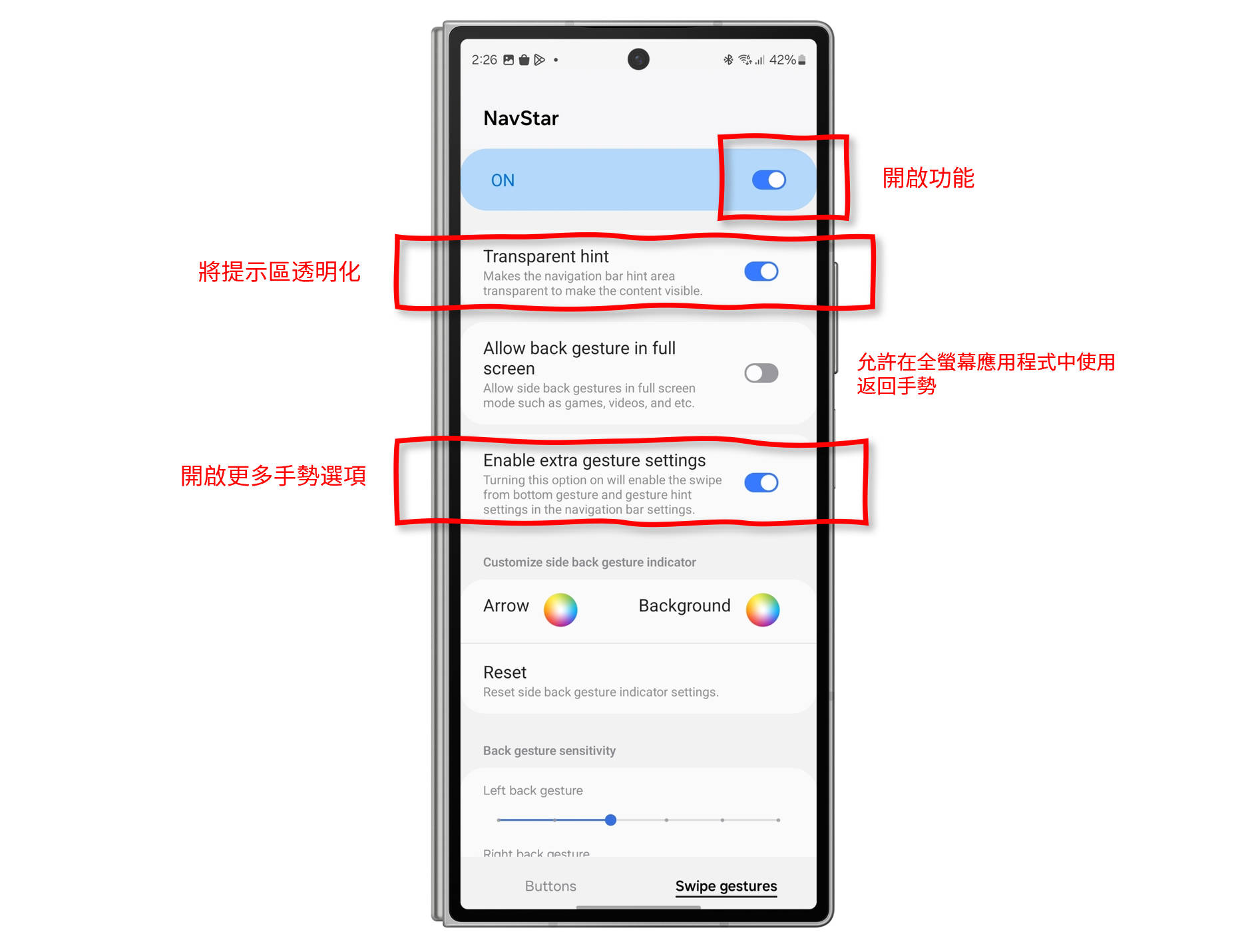 最後在 Good Lock 中打開 NavStar,選擇下方的 Swipe gestures 手勢選項,並將最上方的開關打開到 On