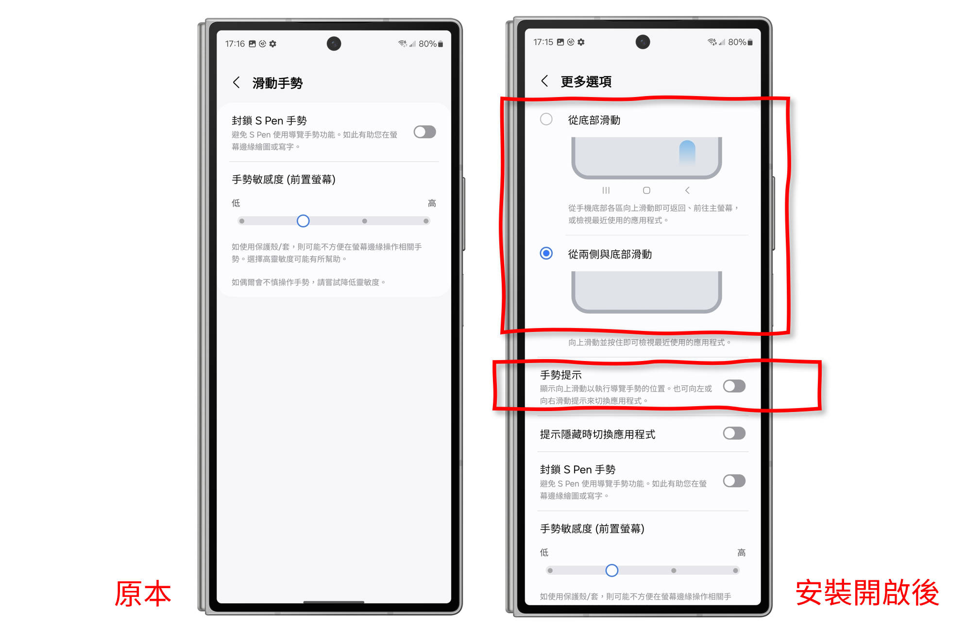 接著就可以返回系統內建的手勢設定區,選擇更多,就可以看到修改前跟修改後的差別,我們要的選項就回來啦