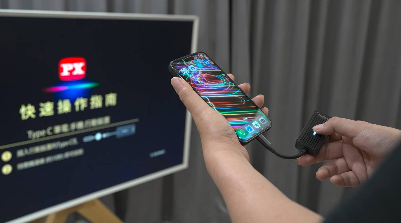 非常小巧的 WTR-1500C 電視連接端,使用者只需將傳輸器插入電視的 HDMI 介面,通過 USB 供電,然後將手機連接至 Type-C 介面,整個過程便可以輕鬆完成,即使不熟悉電子設備也能快速上手,享受無線投影的便利。