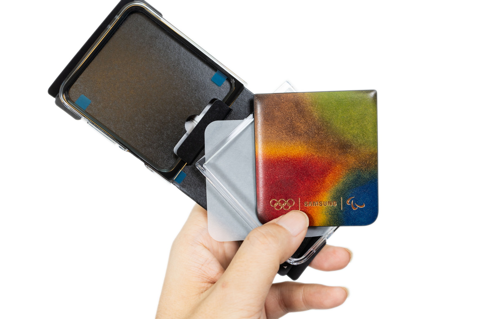 接著看主角 奧運版本三星 Galaxy Z Flip 6 本身啦~ 真的是很可愛典雅的設計,當然出廠的保護膜和一般機器是相同的,主要差異還是在機器背部的印刷上