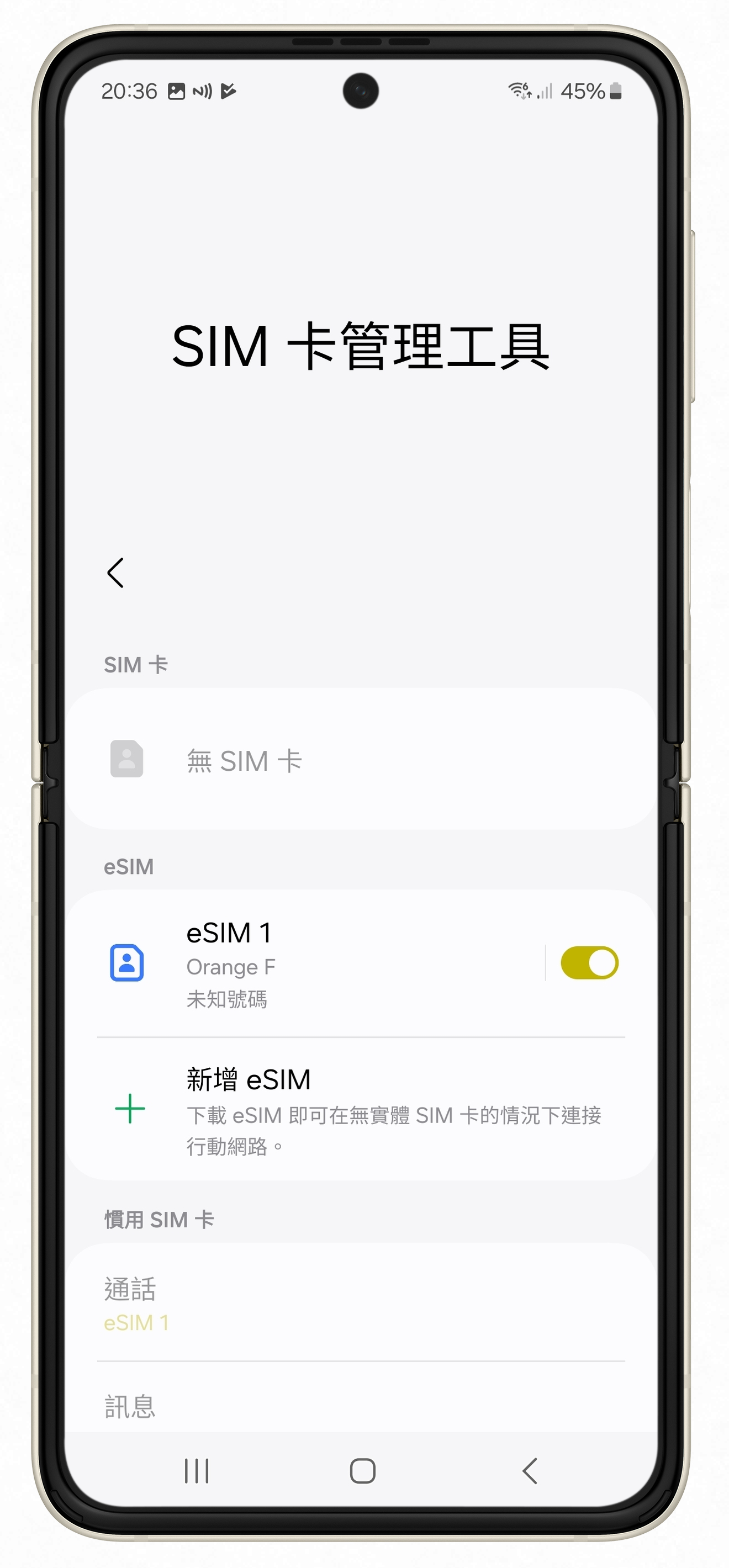 第一次開機會預先安裝載入 Orange F 電信 eSIM(應該就是贈送選手的 100GB 流量 eSIM),我在台灣嘗試當然是不能使用