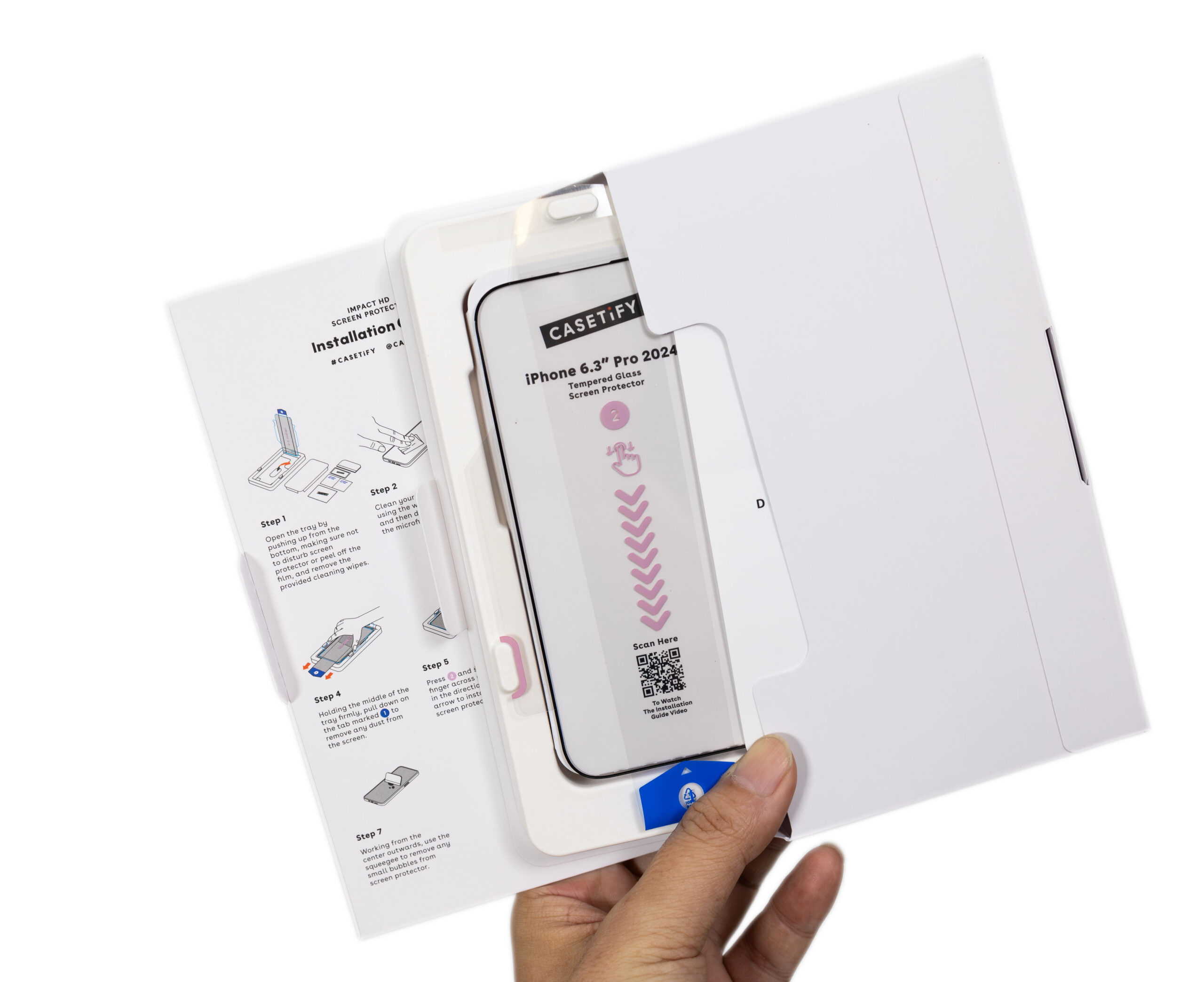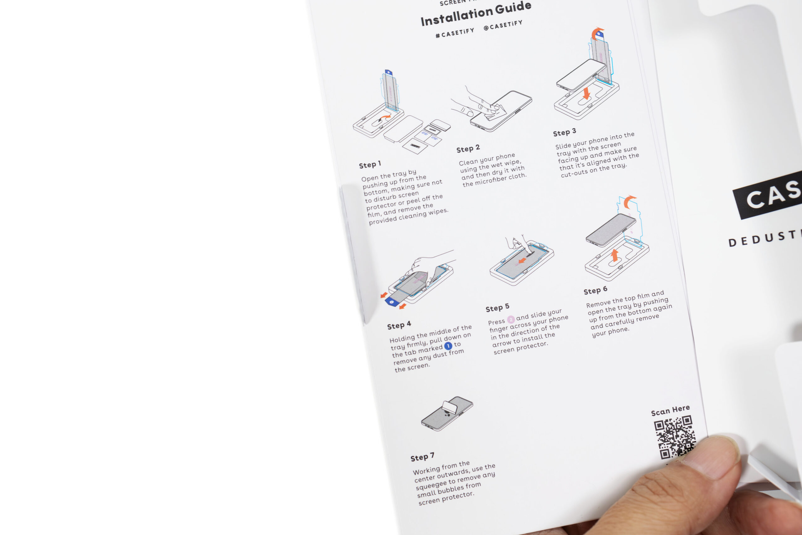 CASETiFY強悍HD螢幕保護貼包裝內層就有提供安裝說明,每個商品內也都有隨附安裝工具,自己在家就可以不假他人之手,自行輕鬆安裝螢幕保護貼。