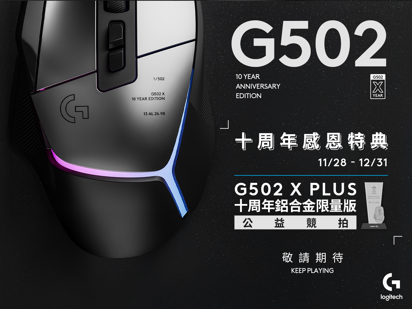 為響應公益,台灣 Logitech G 與 中國信託慈善基金會合作,推出限量 6 隻 G502 X PLUS AL 的公益競標活動。拍賣將於 11 月 28 日至 12 月 1 日 在 Logitech G 官網進行,每隻起標價為新台幣 6,990 元,每標加價 100 元,所得全數捐贈,用於扶助偏鄉弱勢孩童。