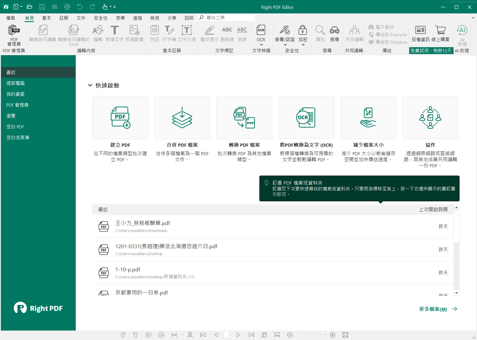 棣南 PDF 文電通專業版可至官網下載,有 Windows 版本與 macOS 版本,下載完畢後就會進入 14 天免費試用期,試用期間所有功能都是開放使用並無鎖住某些重要功能,這點值得讚賞,讓消費者可確實全方面使用可再購買,而棣南 PDF 文電通專業版則是由兩個獨立程式組成,Right PDF Editor 、 Right PDF Converter,Editor 為 PDF 文書編輯轉檔軟體,包含 PDF 編輯、轉換、合併、註解、 OCR 等功能。 Converter 具備批次轉換功能,能從多種檔案格式建立 PDF 文件,或轉換 PDF 檔案為其它格式,介面一目瞭然。